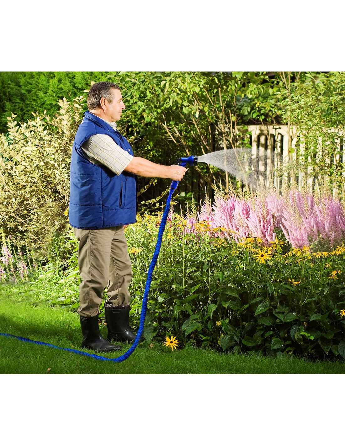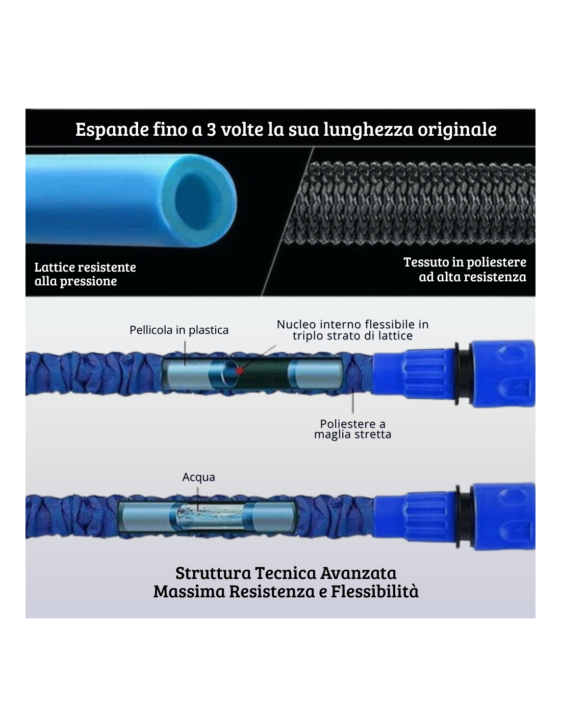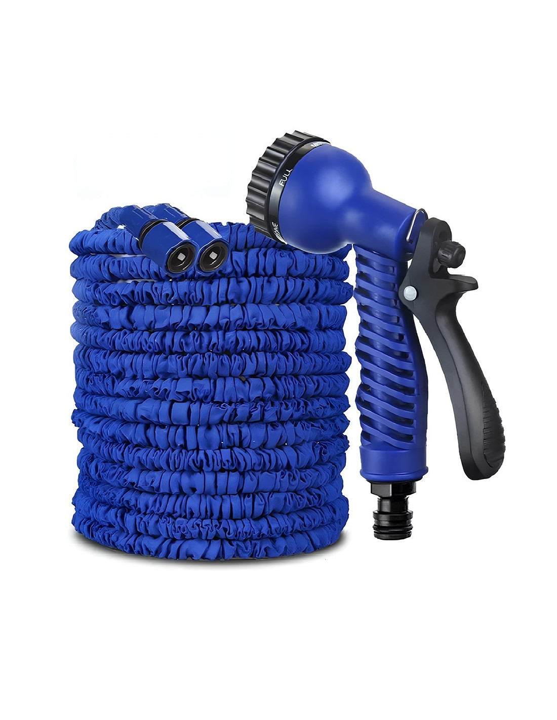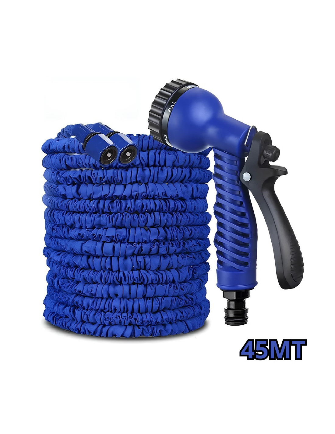 Tubo da giardino estendibile 30 metri, resistente, flessibile e con pistola a 7 Getti. Rendi l’irrigazione del tuo giardino semplice, efficiente e senza stress con il Tubo da Giardino Estendibile da 30 metri. Progettato per espandersi fino a 3 volte la sua lunghezza originale, questo tubo offre massima flessibilità durante l’uso e si ritrae automaticamente dopo l’utilizzo per un facile stoccaggio. Costruito con materiali ad alta resistenza, include una guaina esterna in fibra di poliestere e una struttura interna in plastica ad alta densità, che garantiscono durabilità, resistenza a ruggine e perdite. Il raccordo universale a prova di perdite assicura un collegamento stabile e sicuro a qualsiasi rubinetto standard, senza sgocciolamenti. La pistola multifunzione con 7 modalità di getto: tra cui doccia, spruzzo, cono, piatto, pieno, centrale e getto diretto, ti permette di adattare il flusso d’acqua in base all’esigenza: dall’irrigazione delicata delle piante al lavaggio di superfici.