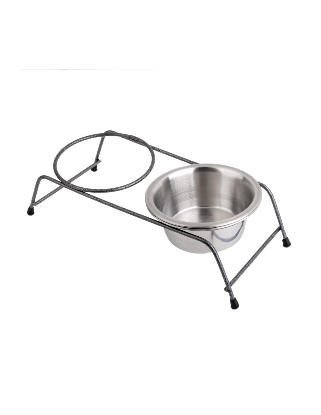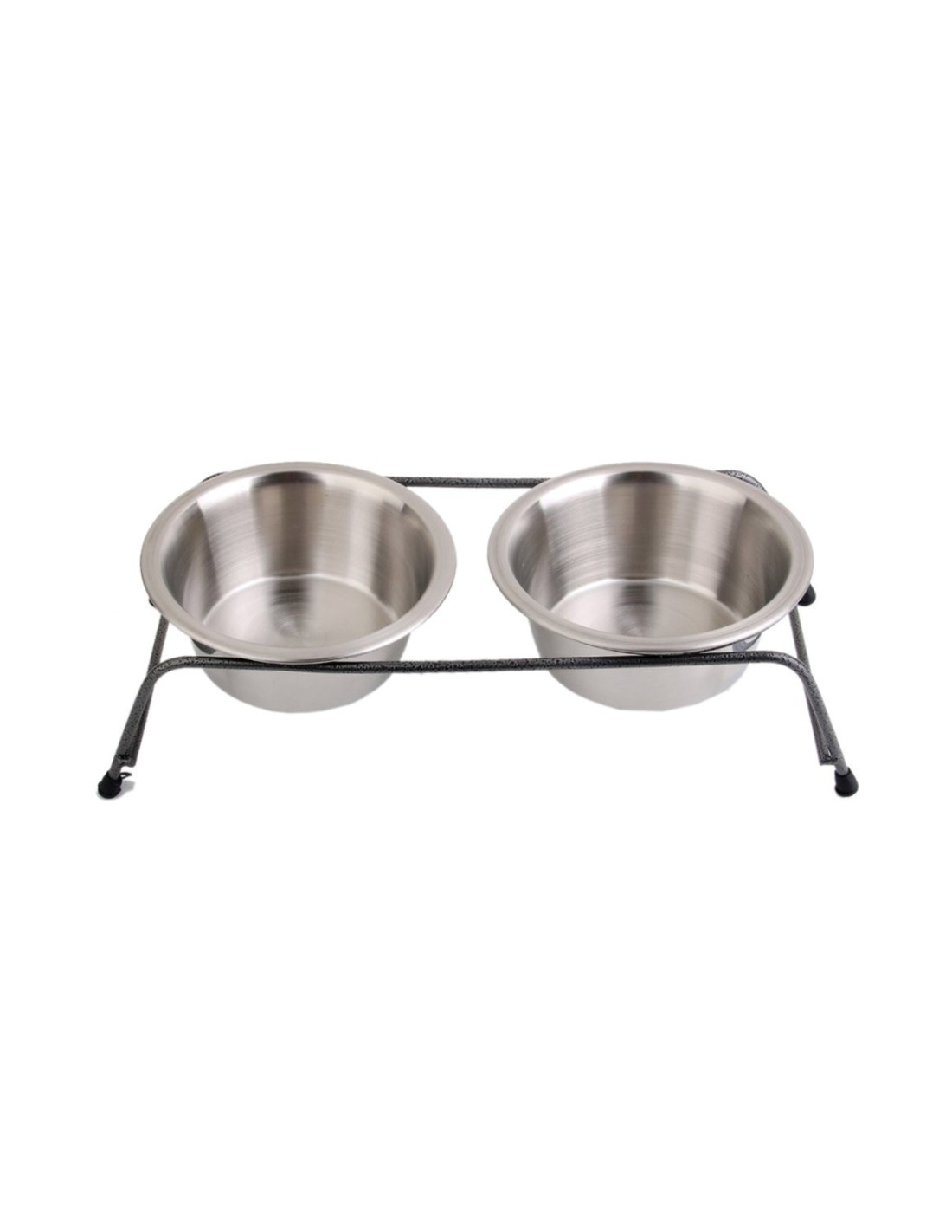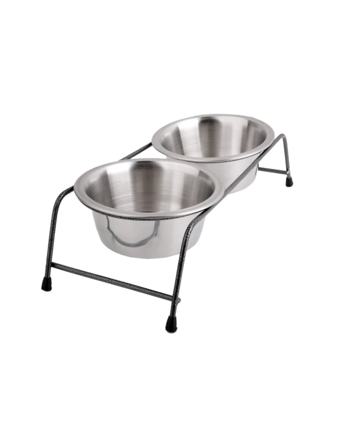 Solitamente tutti i cani hanno almeno due ciotole a disposizione, una per l'acqua ed una per la pappa. Ma se non volete che queste vengano sparse in giro per casa, potete acquistare una comodissima doppia ciotola con supporto in acciaio, poste su una struttura metallica rialzata dotata di piedini in gomma antiscivolo.