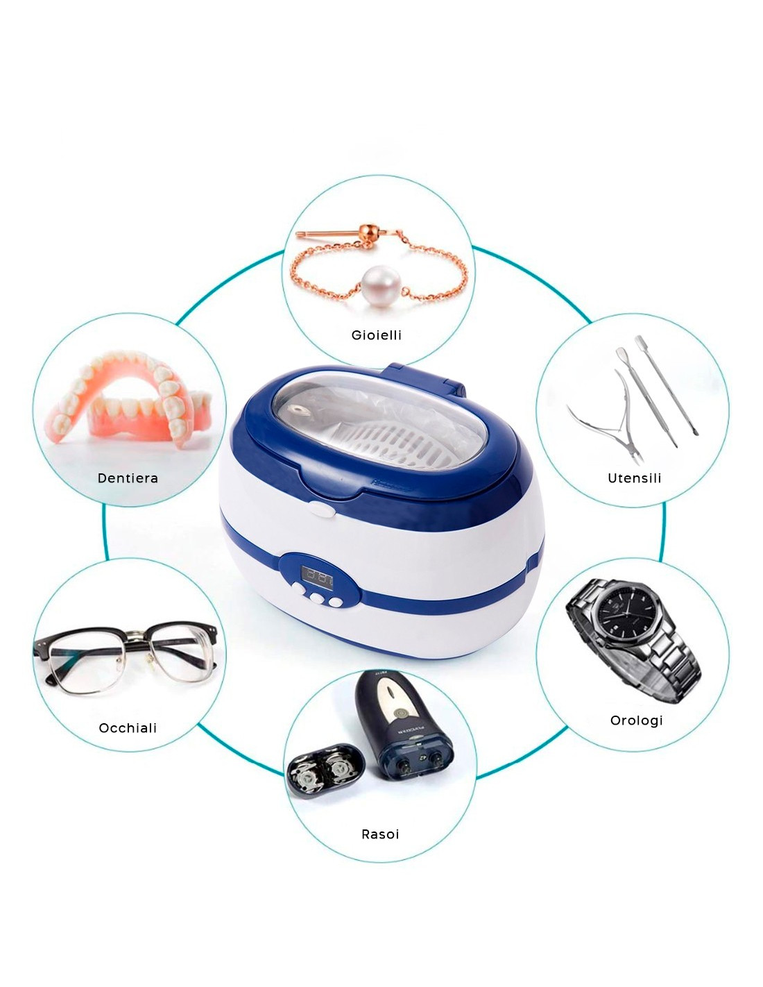 Questo sterilizzatore ad ultrasuoni garantisce la massima e accurata pulizia e sterilizzazione grazie alle vibrazioni e ultrasuoni rilasciati. La sua utilità si estende in molti altri campi, come gioiellieri che possono pulire nei minimi dettagli gioielli ed orologi, ma anche per oculisti garantendo delle lenti sempre pulite e smaglianti. Ma ancora non e finita, perchè anche chi non e professionista in questi lavori può regalarsi tali benefici ai quali si aggiunge la sterilizzazione di oggetti quotidiani e casalinghi come spazzolini, dentiere, argenteria, posate, piccoli oggetti metallici e molto altro ancora. La frequenza della pulizia e le vibrazioni del fluido arrivano a 40kHz. Il voltaggio e di 110V-220V/60Hz/35W e la capacita della vaschetta e di 600 ml di acqua.