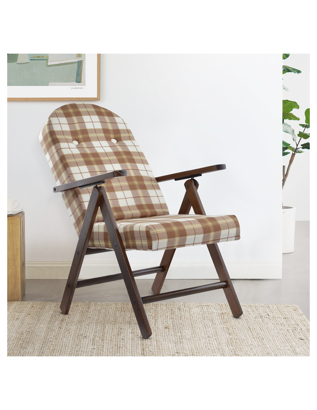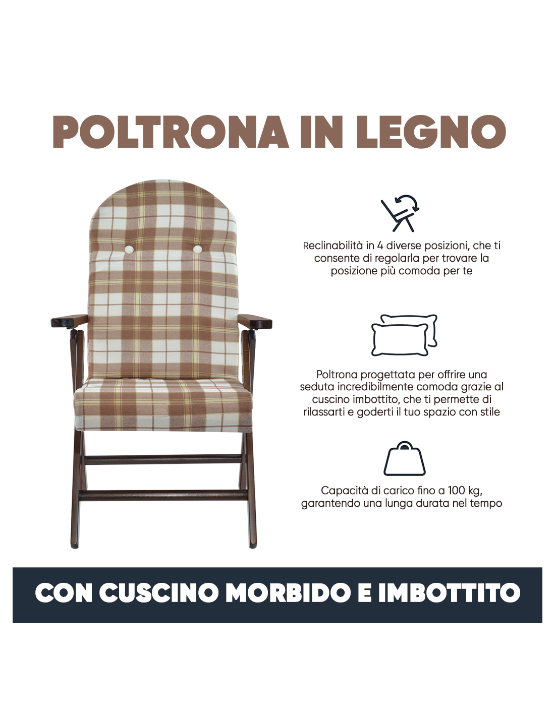 Con il suo design in stile country retrò, la poltrona Amalfi aggiunge un tocco di rustica eleganza a qualsiasi ambiente. Il cuscino presenta una trama scozzese, che aggiunge un tocco di vivacità e personalità al suo aspetto, rendendola perfetta per chi cerca un tocco di fascino tradizionale. Una delle caratteristiche distintive di questa poltrona è la sua reclinabilità in 4 diverse posizioni, che ti consente di regolarla per trovare la posizione più comoda per te. Inoltre, quando non è in uso, questa poltrona si chiude facilmente, occupando pochissimo spazio, il che la rende ideale per ambienti con spazi limitati.