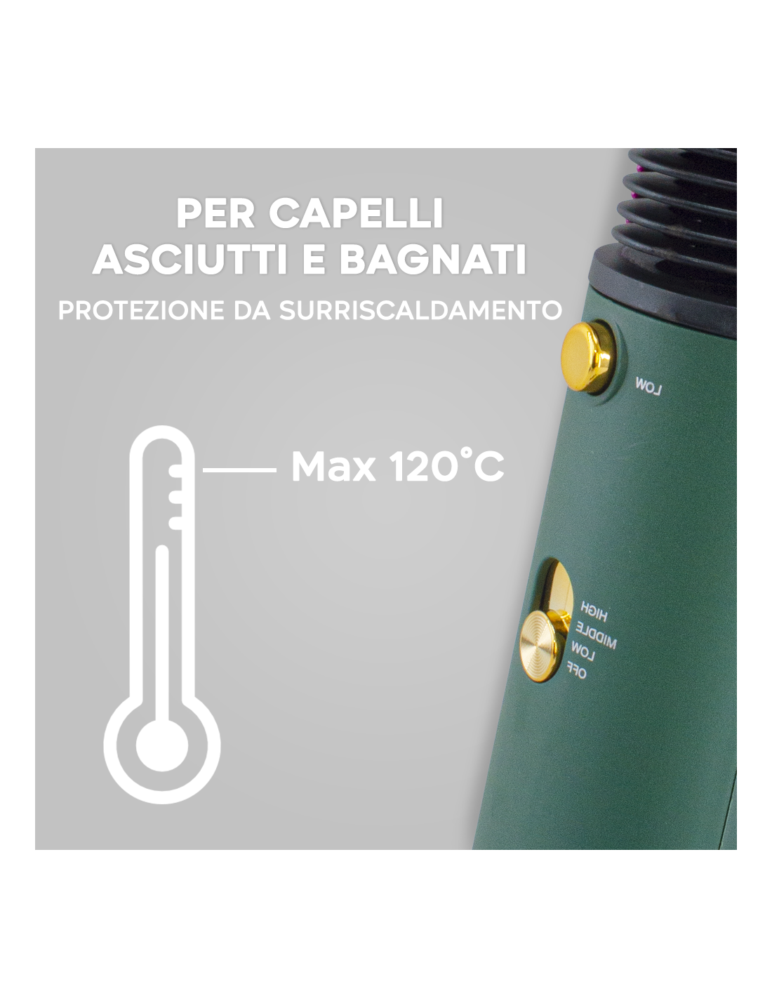 Questa spazzola è diversa da ogni altra già presente in commercio: la sua forma conica e compatta la rende ancora più semplice da maneggiare, le ciocche di capelli vengono facilmente lavorate per poter ottenere volume e una piega invidiabile. Inoltre, la forma a cono può essere sfruttata per arrotondare le ciocche e ottenere anche una piega mossa o boccoli. La sua potenza di 1600W, inoltre, lo rende un phon di tutto rispetto in grado di asciugare in pochissimo tempo, le sue dimensioni ridotte invece ti consentiranno di trasportarlo facilmente con te anche durante i tuoi viaggi o in palestra.