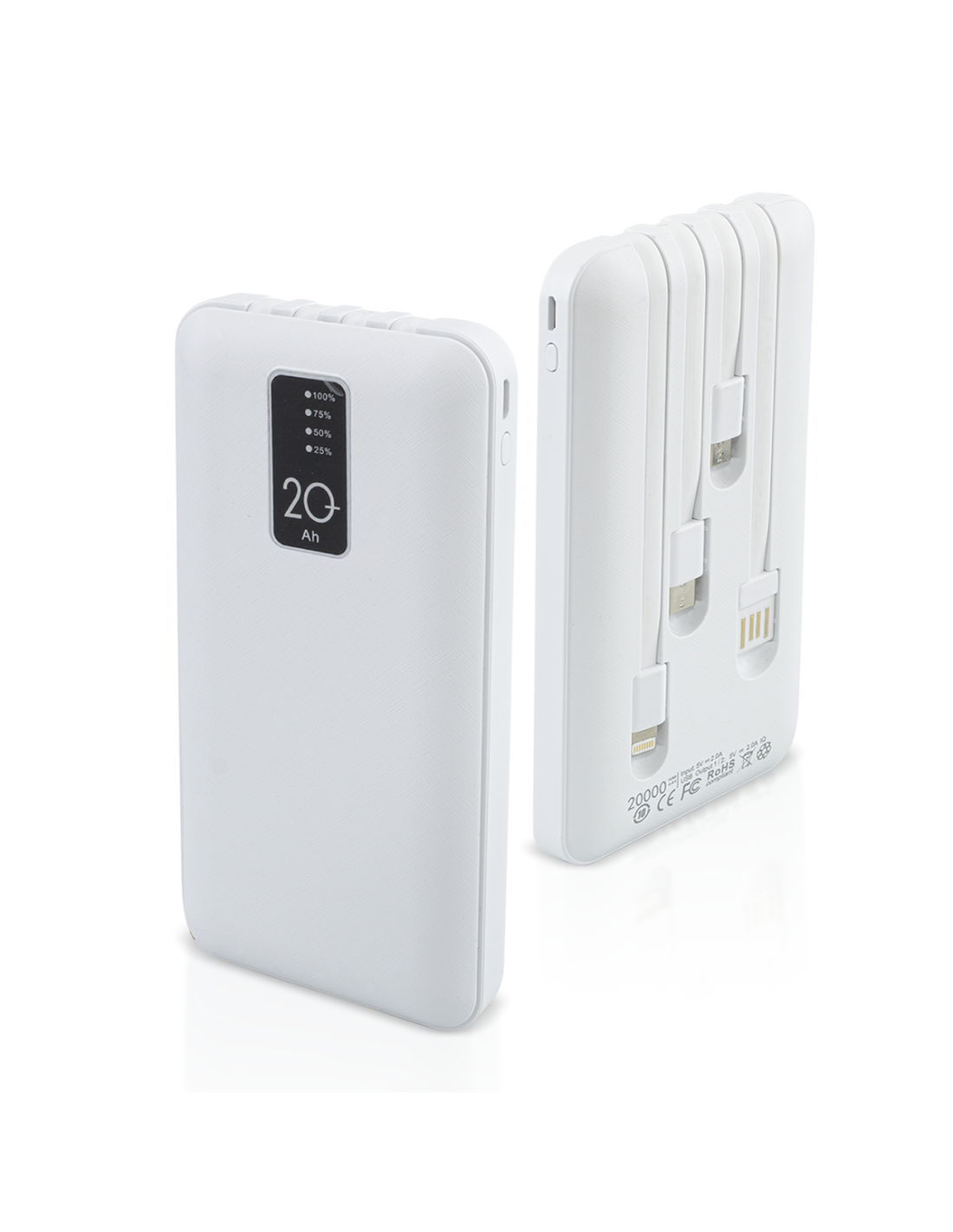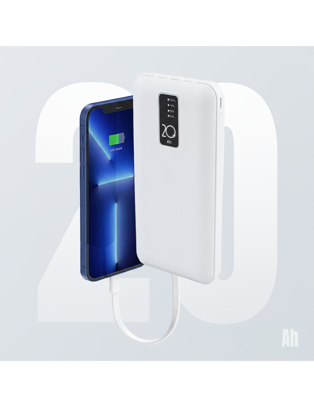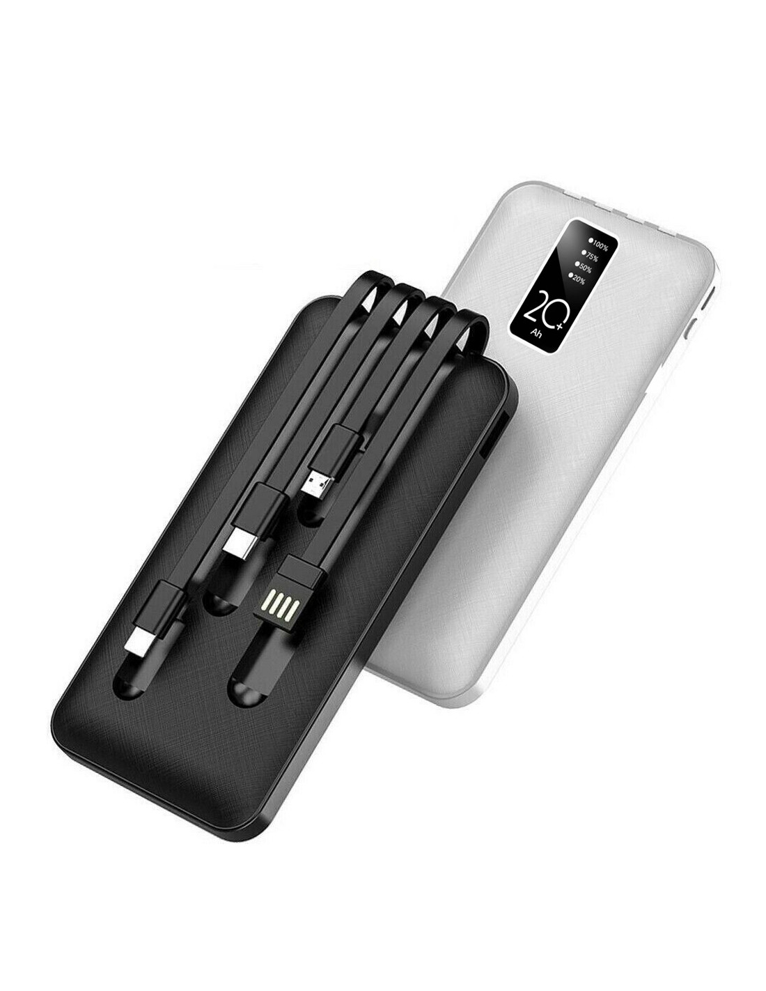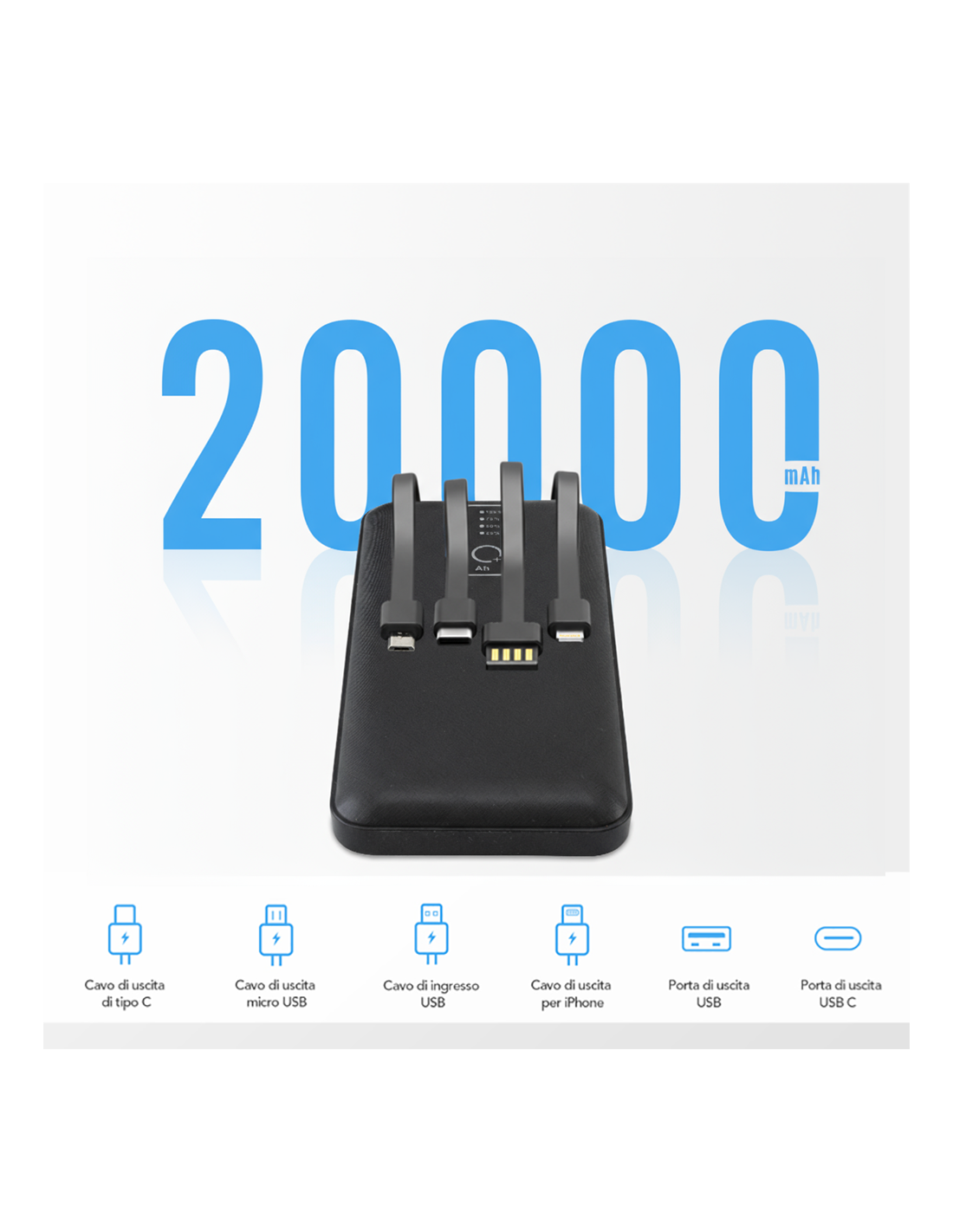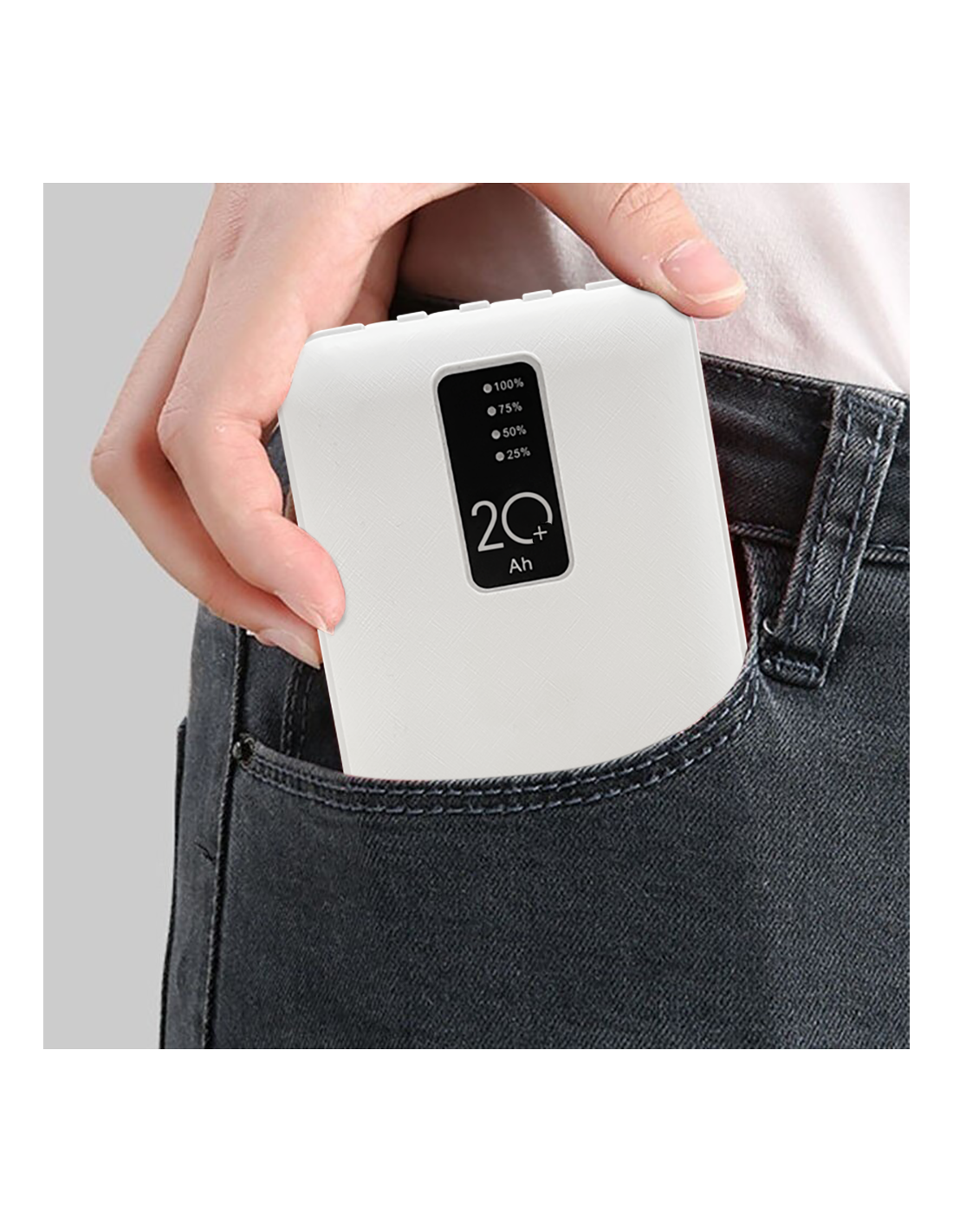 Dotato di una potente capacità di 20000mAh, questo powerbank ti consente di ricaricare non solo il tuo cellulare, ma anche il tablet e persino il tuo PC grazie ai 4 cavi inclusi. Non importa dove ti trovi, avrai sempre a disposizione energia aggiuntiva per i tuoi dispositivi. Il design moderno e compatto lo rende facile da trasportare: puoi tenerlo comodamente in borsa o tenerlo nell'auto per qualsiasi emergenza.
