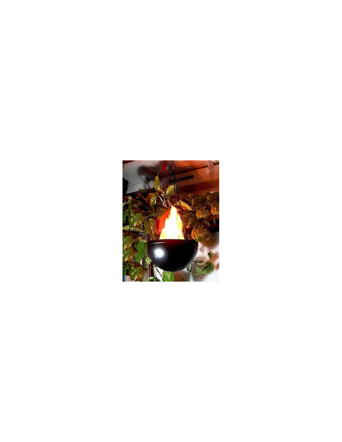 La lampada e' composta da una mezza sfera in materiale plastico con al suo interno una ventola che attivata tramite corrente fa sollevare e muovere dei pezzi di stoffa intagliata a forma di fiamma di colore bianco / rosso / arancio. Grazie all'illuminazione di due faretti, uno di colore giallo e l'altro arancio, rendono questo grandioso effetto ottico di una fiamma vera e propria confondibile facilmente con una reale.