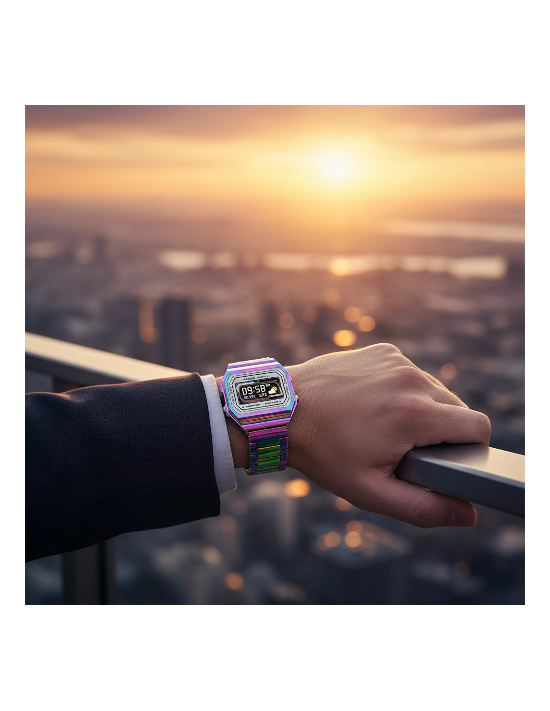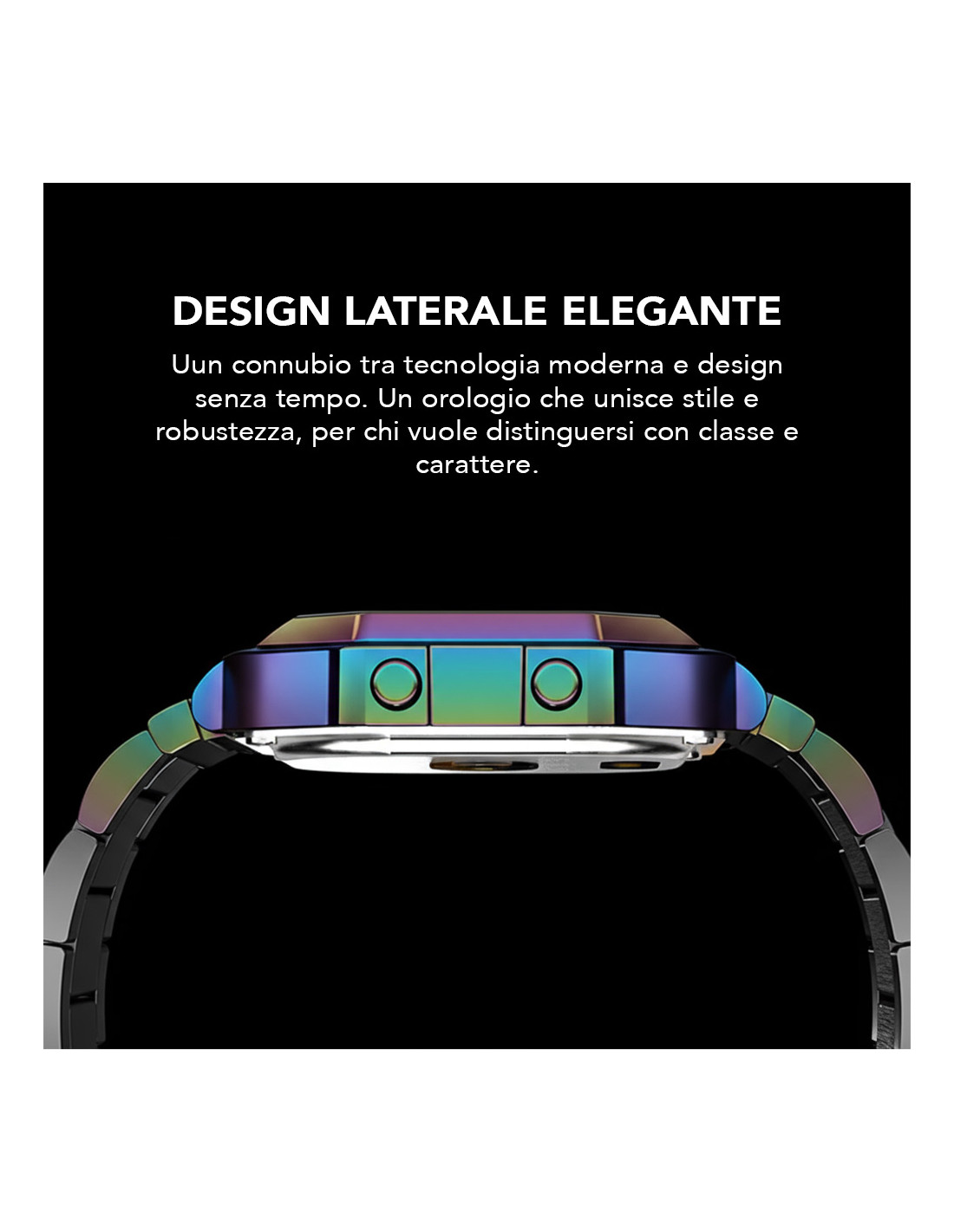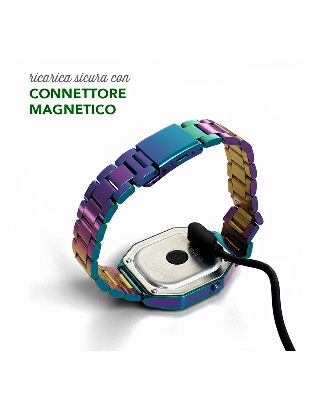 Grazie al suo design moderno e alle varianti di colore Oro, Argento, Nero e Multicolor (sfumature uniche viola/verde), si adatta a qualsiasi look, dal casual al business.