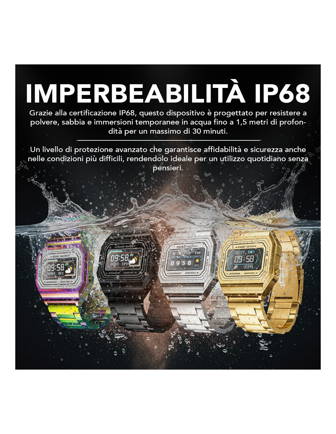 Dotato di schermo da 2,4 cm (0.96") con risoluzione 160×80, monta un processore HS6621 fluido e affidabile. La batteria da 170mAh garantisce un’ottima autonomia, mentre la certificazione IP68 lo rende resistente ad acqua e polvere, ideale anche durante allenamenti intensi o giornate all’aperto.