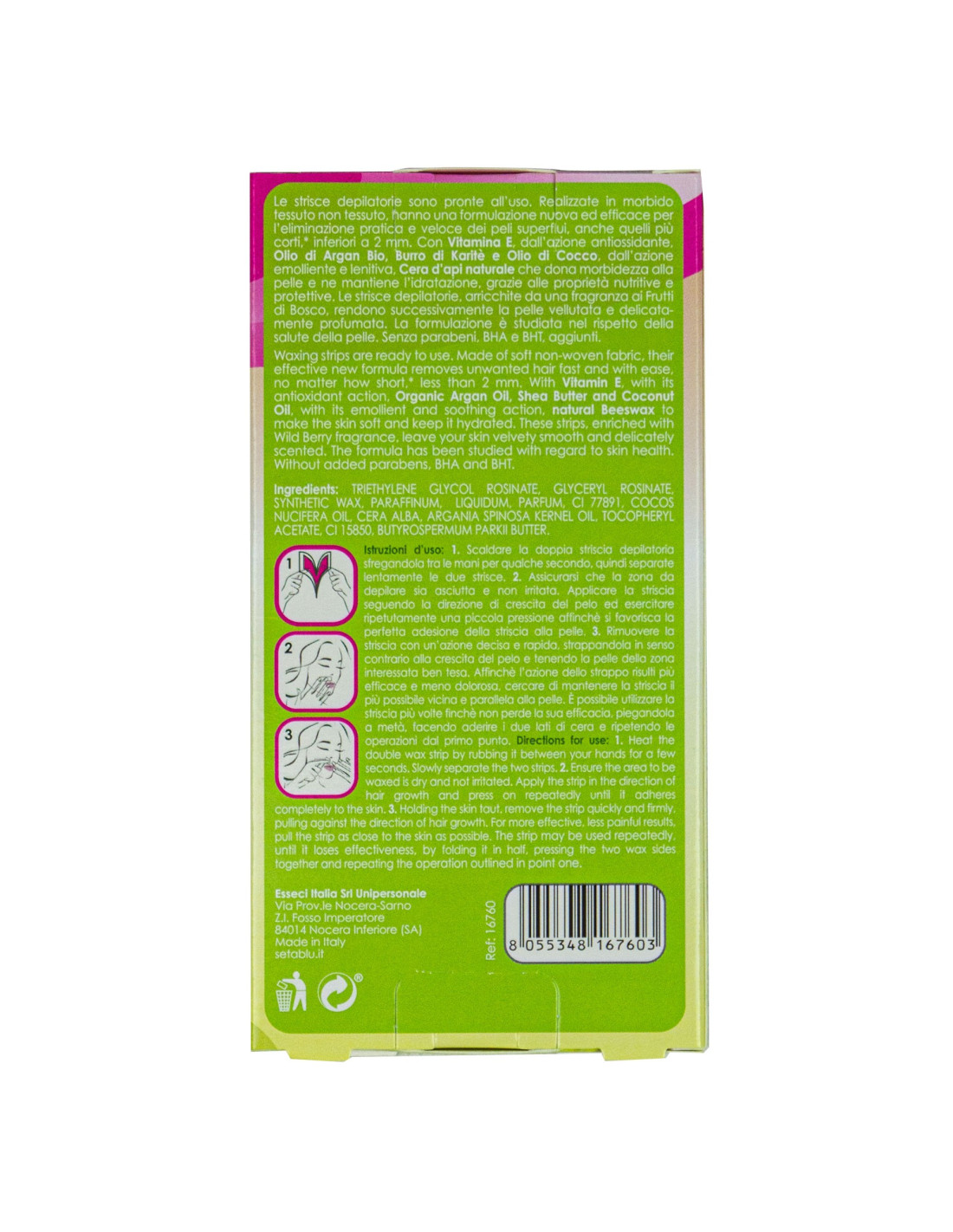 Le strisce depilatorie sono pronte all'uso. Realizzate in morbido tessuto non tessuto, hanno una formulazione nuova ed efficace per l'eliminazione pratica e veloce dei peli superflui, anche di quelli più corti. Con vitamina E, dall'azione antiossidante, con Cera d'Api e Olio d'Argan naturale bio. L'azione emolliente, lenitiva e nutriente della cera d'Api permette l'uso di queste strisce anche per pelli più sensibili.