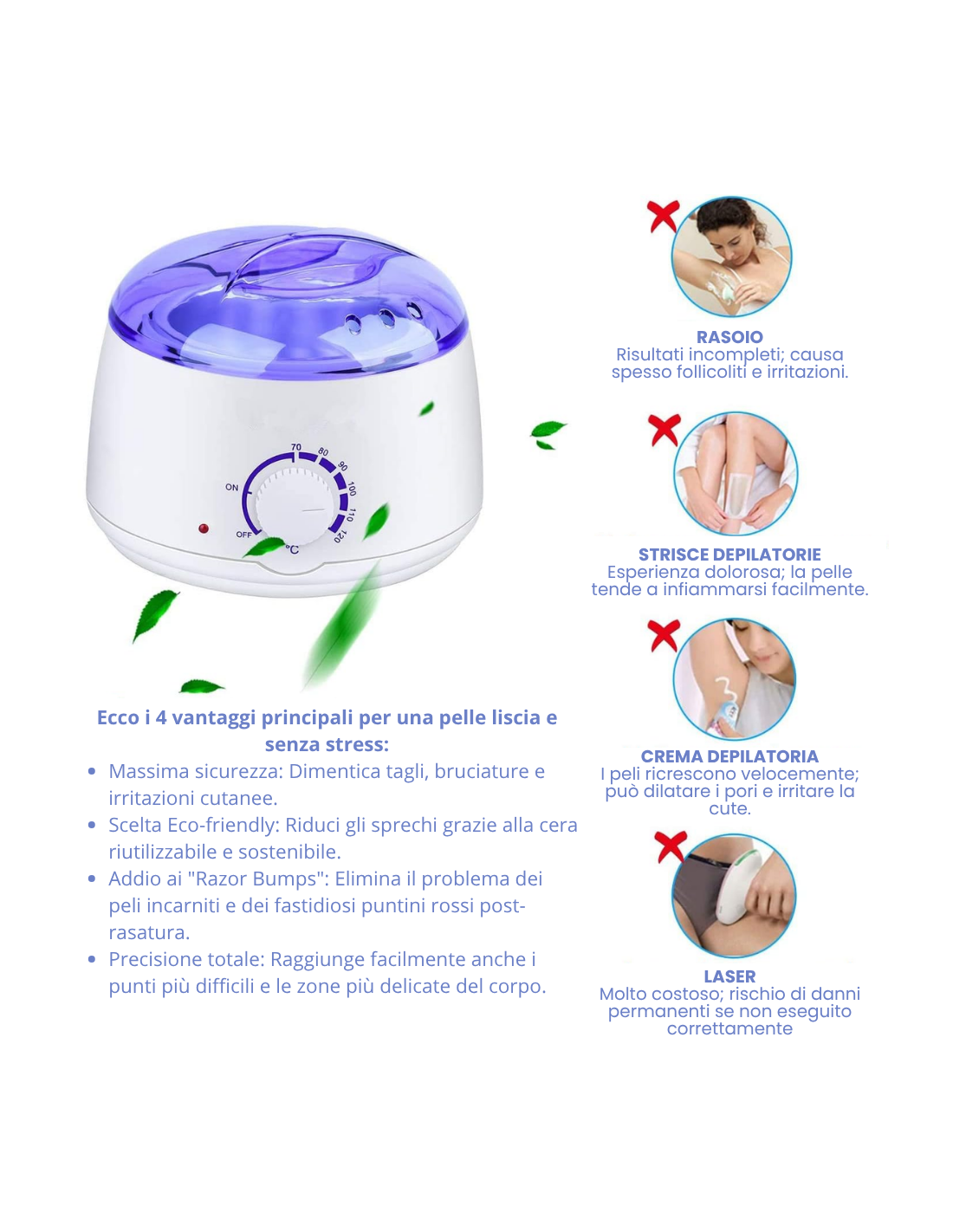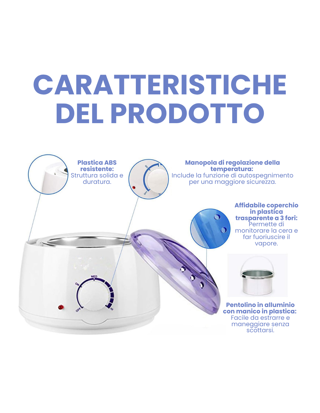 Inserisci i Grani all'interno dello Scalda Cera, attendi che il composto si sciolga, utilizza le Spatole in legno per facilitare
