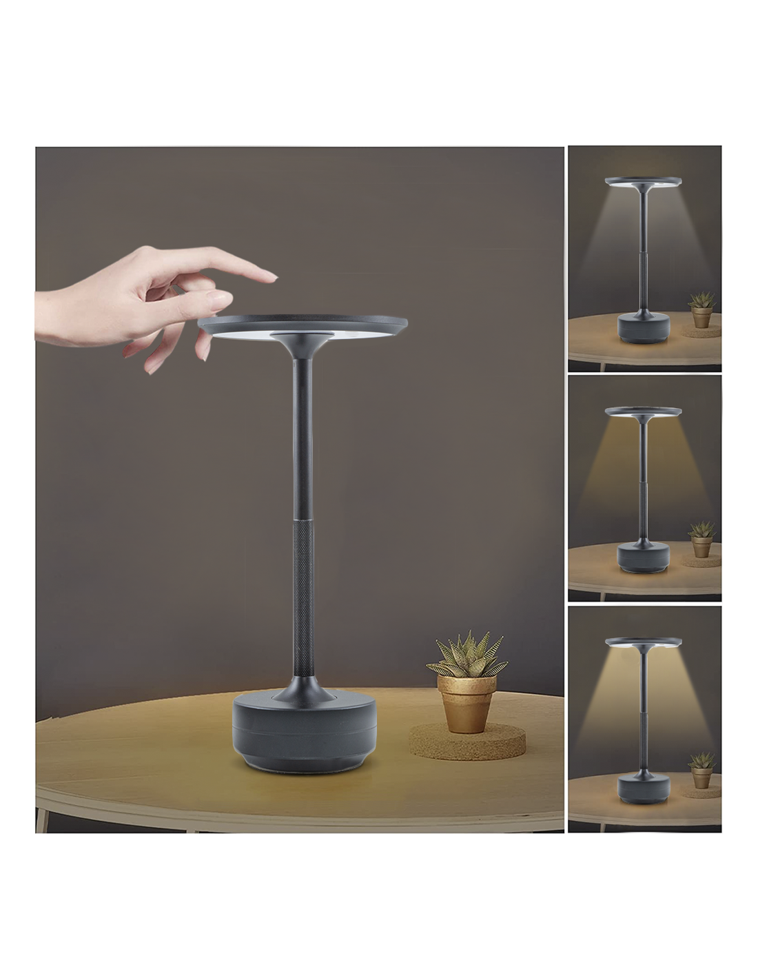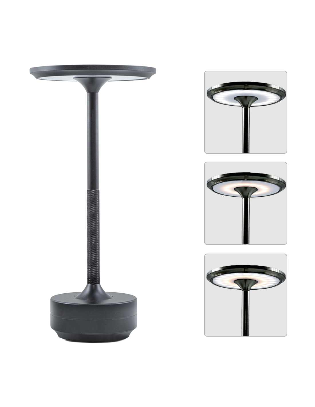 Lampada LED ricaricabile da tavolo, design ultra moderno, sia adatta sia agli ambienti interni che esterni. Realizzata in alluminio verniciato con 3 colorazioni: nera, oro e argento. La lampada si accende e si spegne tramite il controllo touch posto sulla sommità della lampada. Inoltre, è dimmerabile, con lo stesso pulsante touch, toccando ripetutamente, cambi il tipo di luce tra: luce bianca, calda e naturale. Mentre, tenendo premuto fisso, scegli il tipo di intensità: bassa intensità di luce, media o alta.