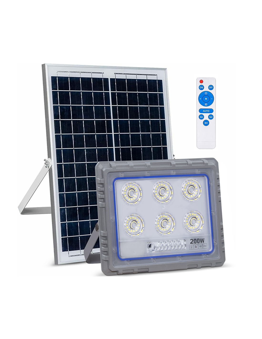 Illumina i tuoi spazi esterni con il potente faretto a LED da 200W con pannello solare fotovoltaico. Questo dispositivo all'avanguardia è progettato per offrire una luce bianca brillante e naturale con una temperatura di colore di 6500K, ideale per giardini, cortili, parcheggi e altre aree esterne. Con una potenza di 200W, questo faretto garantisce un'illuminazione potente ed efficiente, perfetta per ogni esigenza di illuminazione esterna. E' dotato di un sensore crepuscolare avanzato, il faretto rileva automaticamente la quantità di luce ambientale, accendendosi al calar della sera e spegnendosi all'alba. Questa funzione automatizzata assicura un risparmio energetico ottimale. Protezione IP66 rende il faretto completamente impermeabile alla polvere e resistente all'acqua, garantendo un funzionamento affidabile anche nelle condizioni meteorologiche più avverse. Il telecomando incluso permette di gestire tutte le funzioni del faretto da remoto, fino a una distanza di 8 metri. Puoi accendere e spegnere il dispositivo, regolare l'intensità luminosa e impostare un timer per l'illuminazione notturna (3/5/8 ore) per una maggiore flessibilità e comodità. Il pannello solare dispone di cavo da 2mt, consente un'installazione flessibile e pratica, permettendoti di posizionarlo nel punto più esposto alla luce solare per una ricarica efficiente.