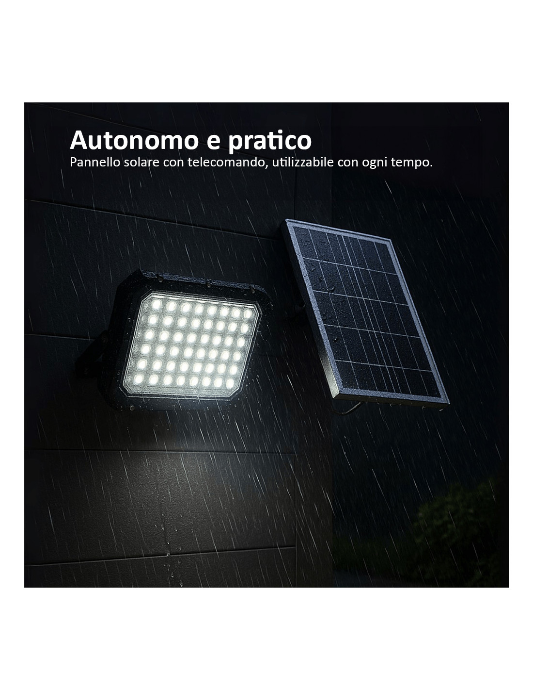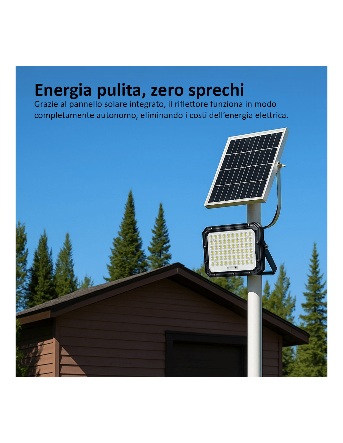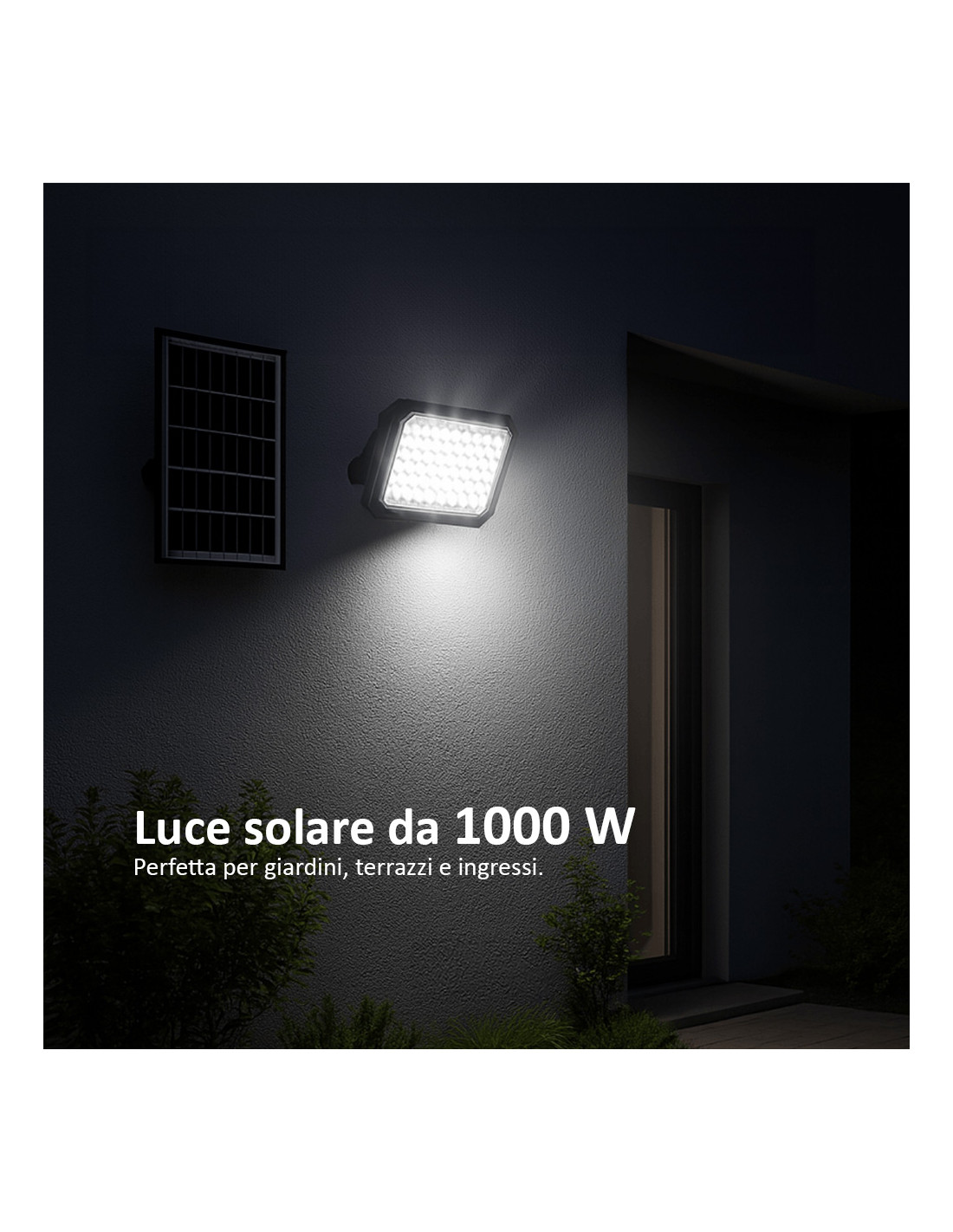 Il faro LED solare da 1000W è la soluzione definitiva per chi desidera un'illuminazione potente, autonoma e totalmente gratuita. Progettato per resistere all'esterno, questo sistema sfrutta l'energia solare integrata per illuminare grandi aree senza la necessità di cavi o collegamenti alla rete elettrica. Grazie al suo design slim e alla tecnologia LED di ultima generazione, è perfetto per mettere in sicurezza e valorizzare giardini, vialetti, ingressi e cortili. Il controllo intelligente e la gestione remota lo rendono un prodotto estremamente versatile, capace di coniugare un'altissima resa luminosa con un impatto ambientale zero.