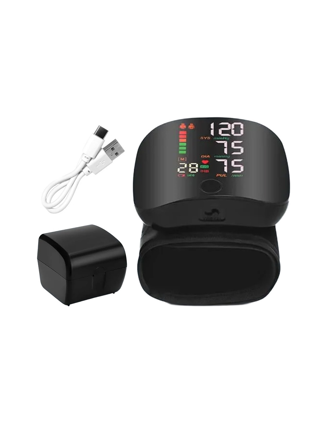 Contenuto confezione: sfigmomanometro da polso, polsino, cavo Type-C, manuale, custodia portatile