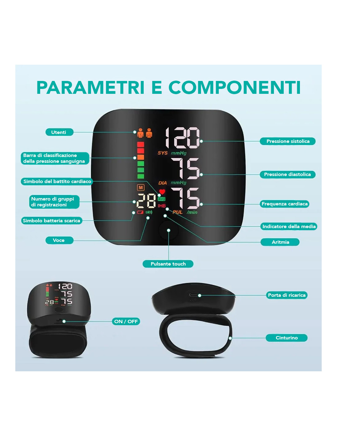 Un dispositivo completo, preciso e facile da usare, pensato per offrire monitoraggio della salute quotidiano direttamente dal polso con il massimo comfort e praticità.