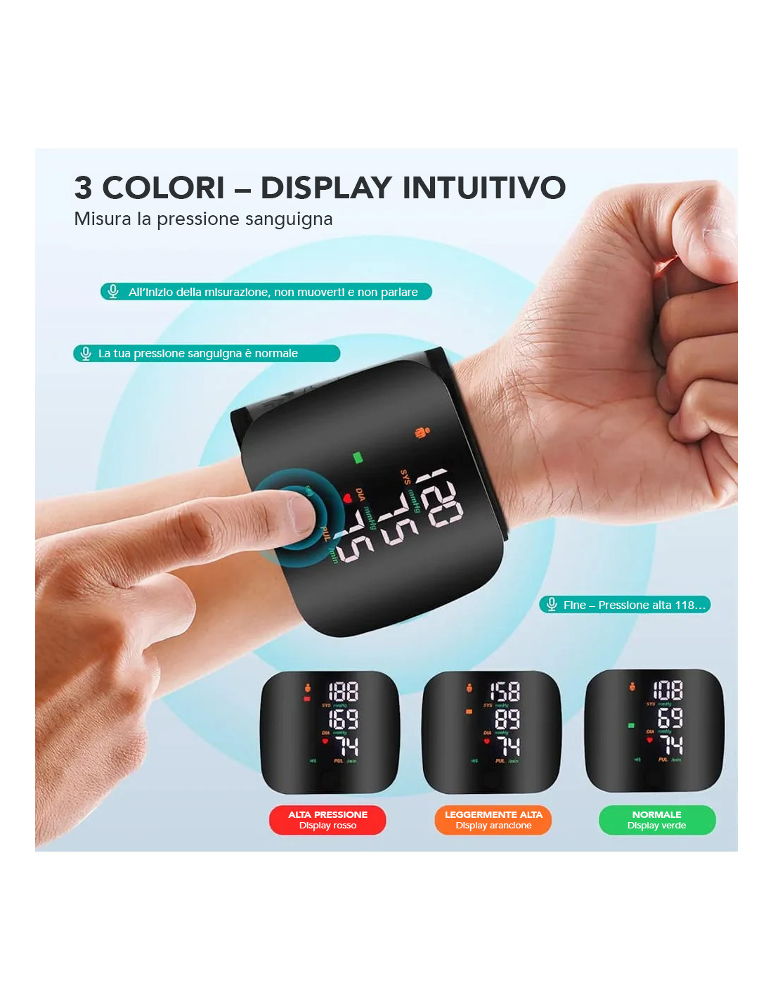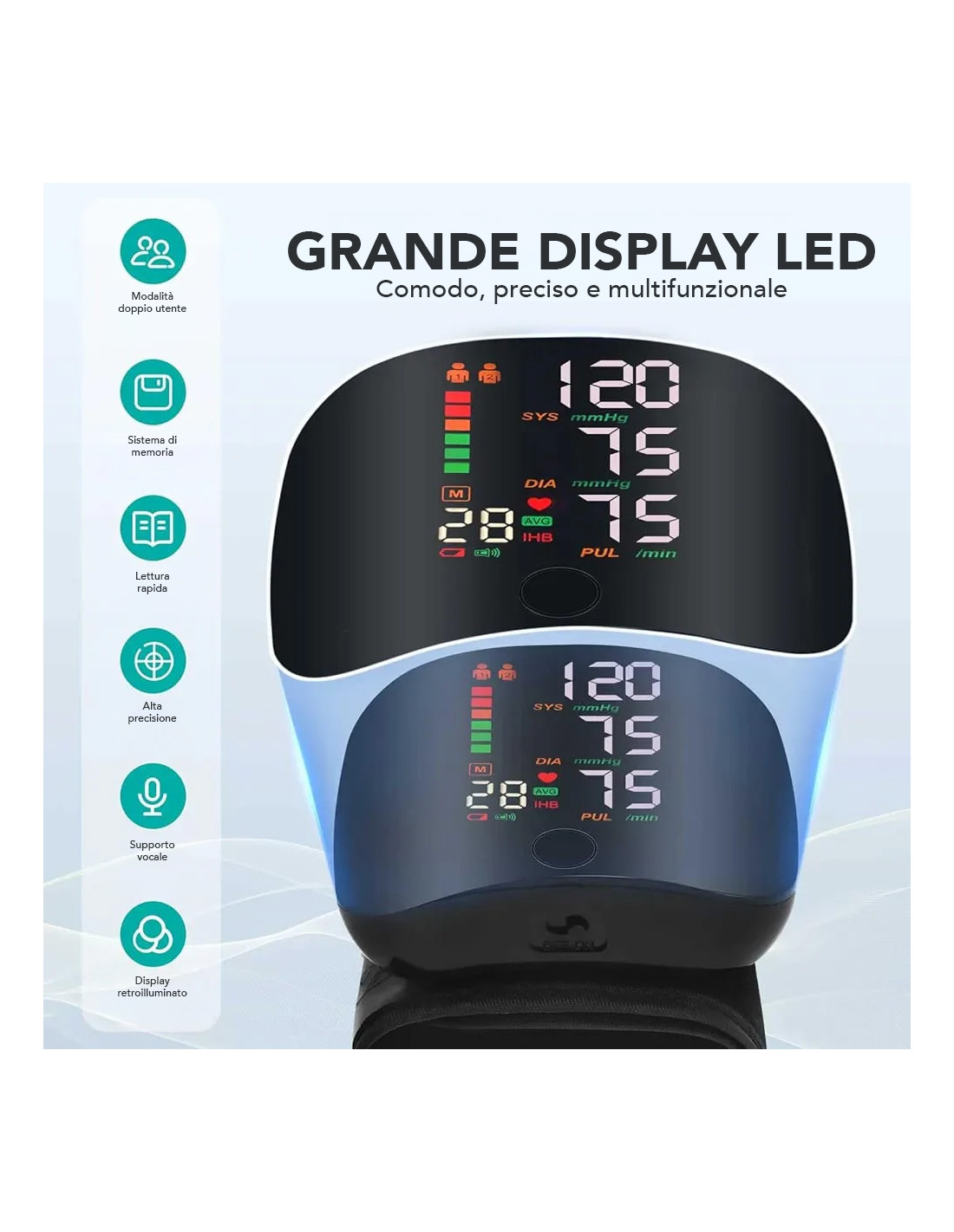 Il dispositivo è dotato di trasmissione vocale in inglese, fornendo indicazioni chiare dei valori misurati, e di un ampio display LED retroilluminato, facile da leggere anche in ambienti bui, perfetto per anziani o persone con problemi di vista.