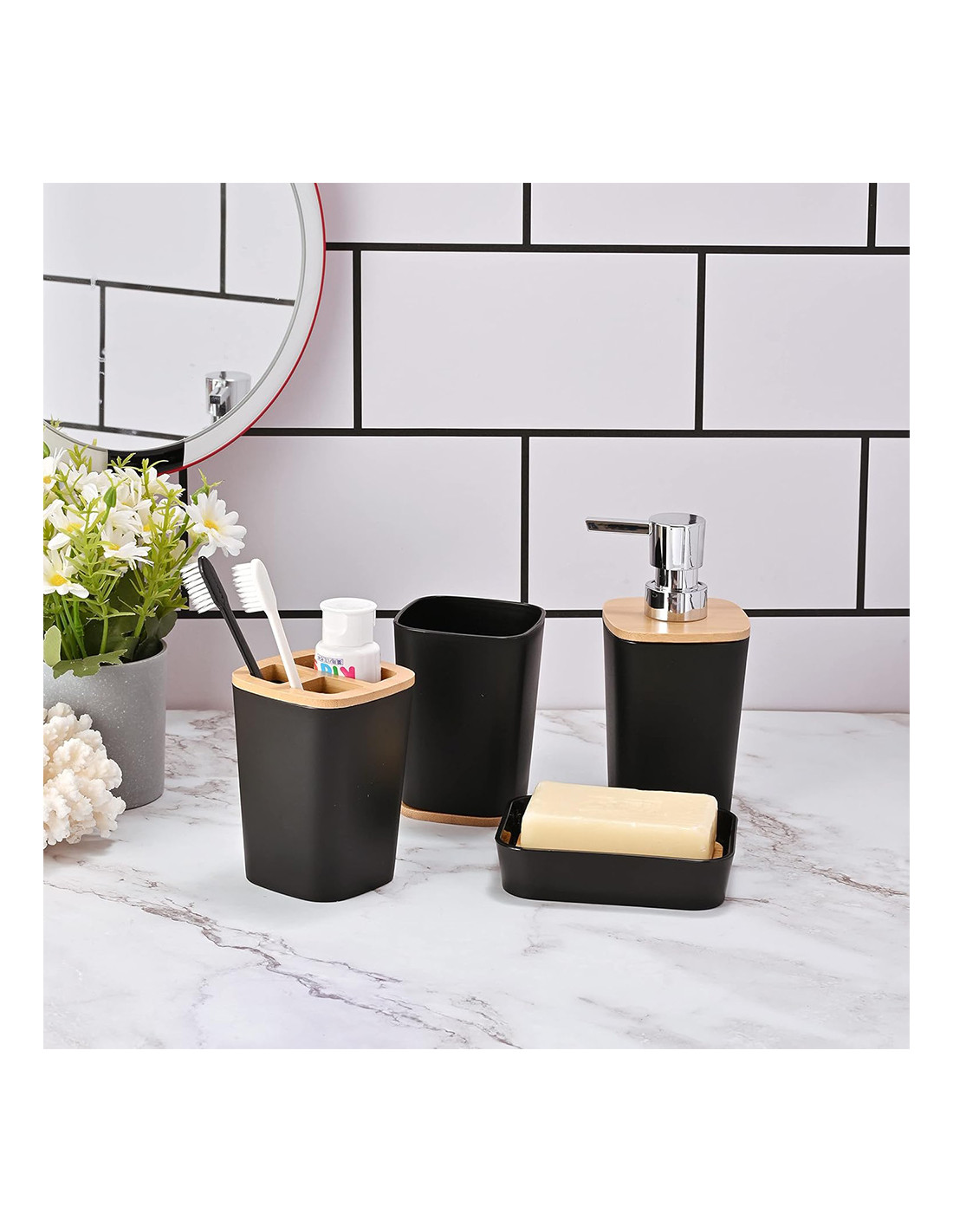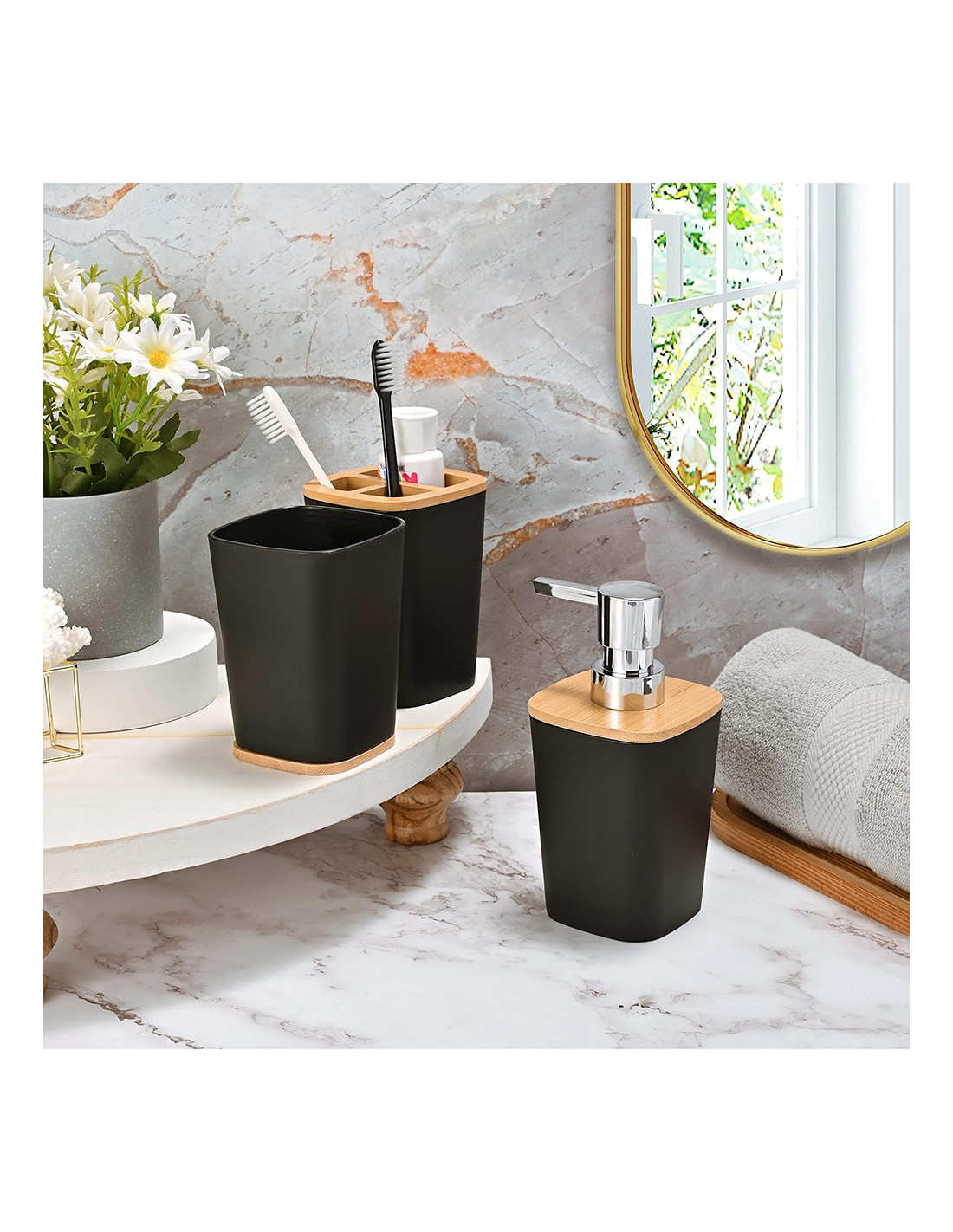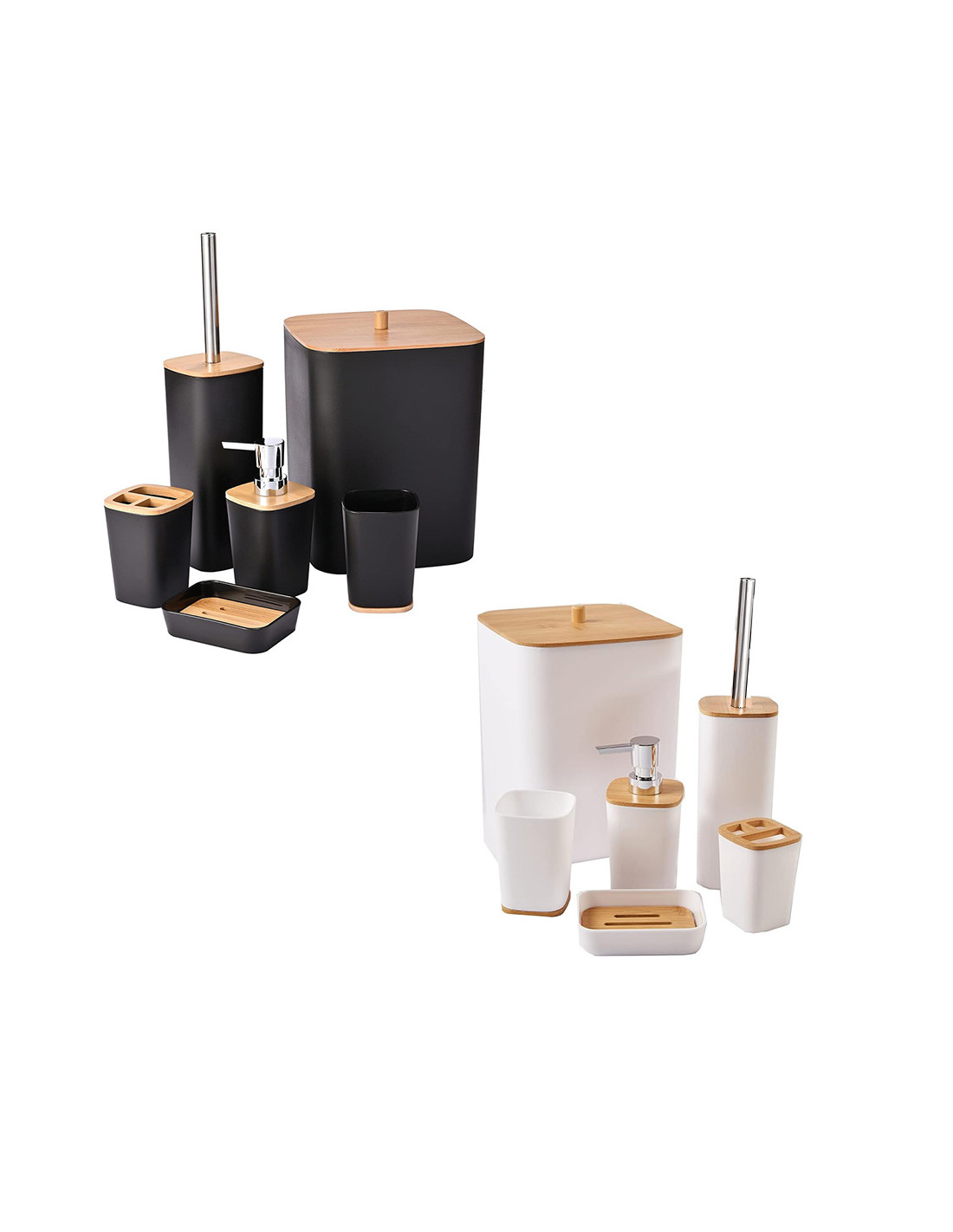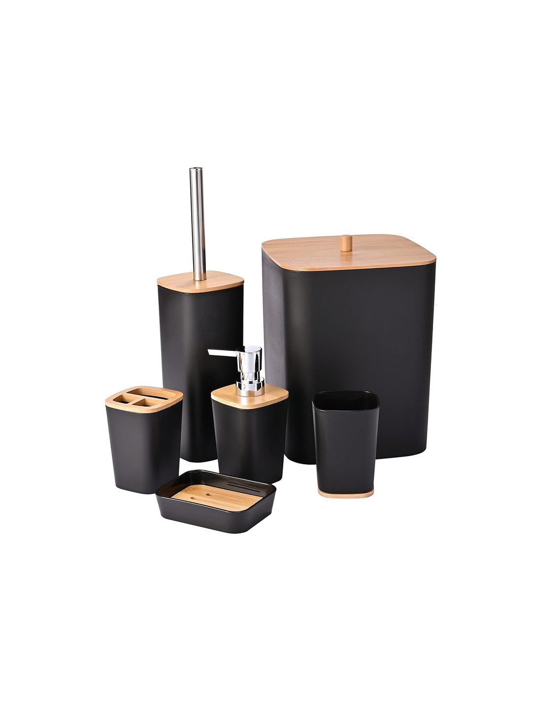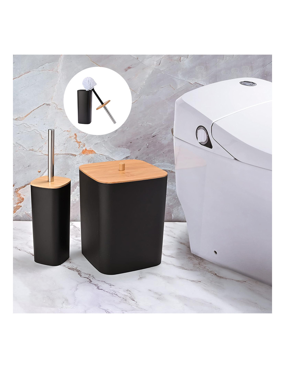 Set Accessori Bagno 6 Pezzi Moderno in Nero e Bambu con Scopino Cestino Rifiuti