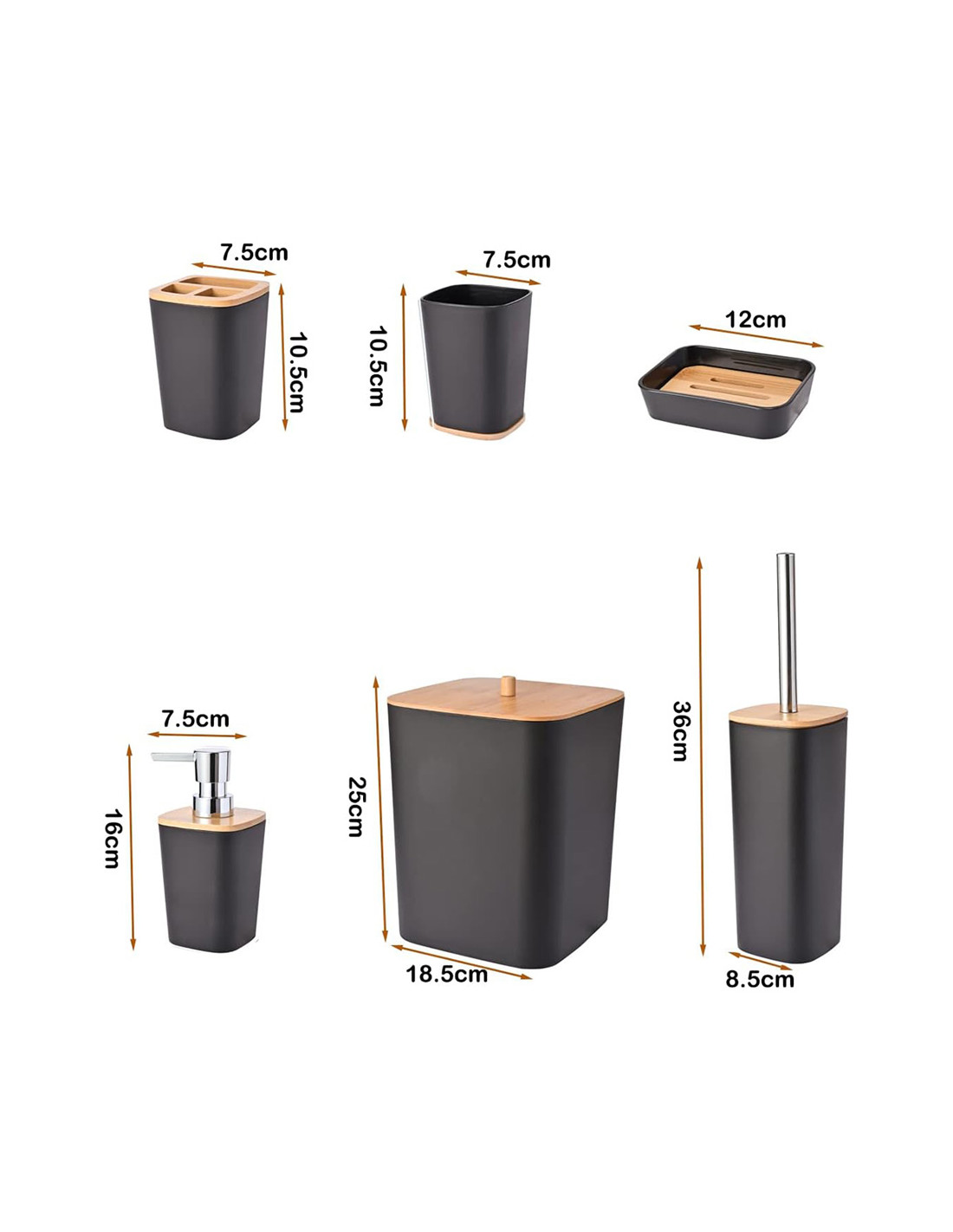 Porta l'arredamento del tuo bagno a nuovi livelli di stile con questo set completo di accessori da 6 pezzi. Realizzato in una combinazione elegante di PP (polipropilene) nero e bambù naturale, questo set è il modo perfetto per evitare il disordine e organizzare i tuoi articoli da toeletta con un tocco di classe contemporanea. La struttura in plastica dura è progettata per essere antiruggine, resistente alla corrosione e durevole nel tempo, garantendo al contempo una superficie liscia estremamente facile da pulire. Che si tratti di un rinnovamento estetico o di una necessità pratica, questo kit offre tutto il necessario per coordinare ogni elemento della stanza: dalla gestione dei rifiuti all'igiene quotidiana. Grazie al suo design raffinato e alla qualità dei materiali, rappresenta anche una scelta eccellente come regalo per un'inaugurazione della casa o per un matrimonio.