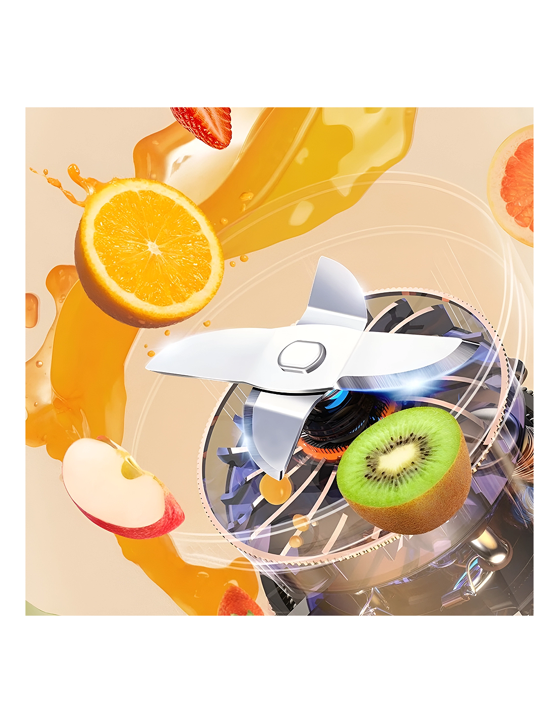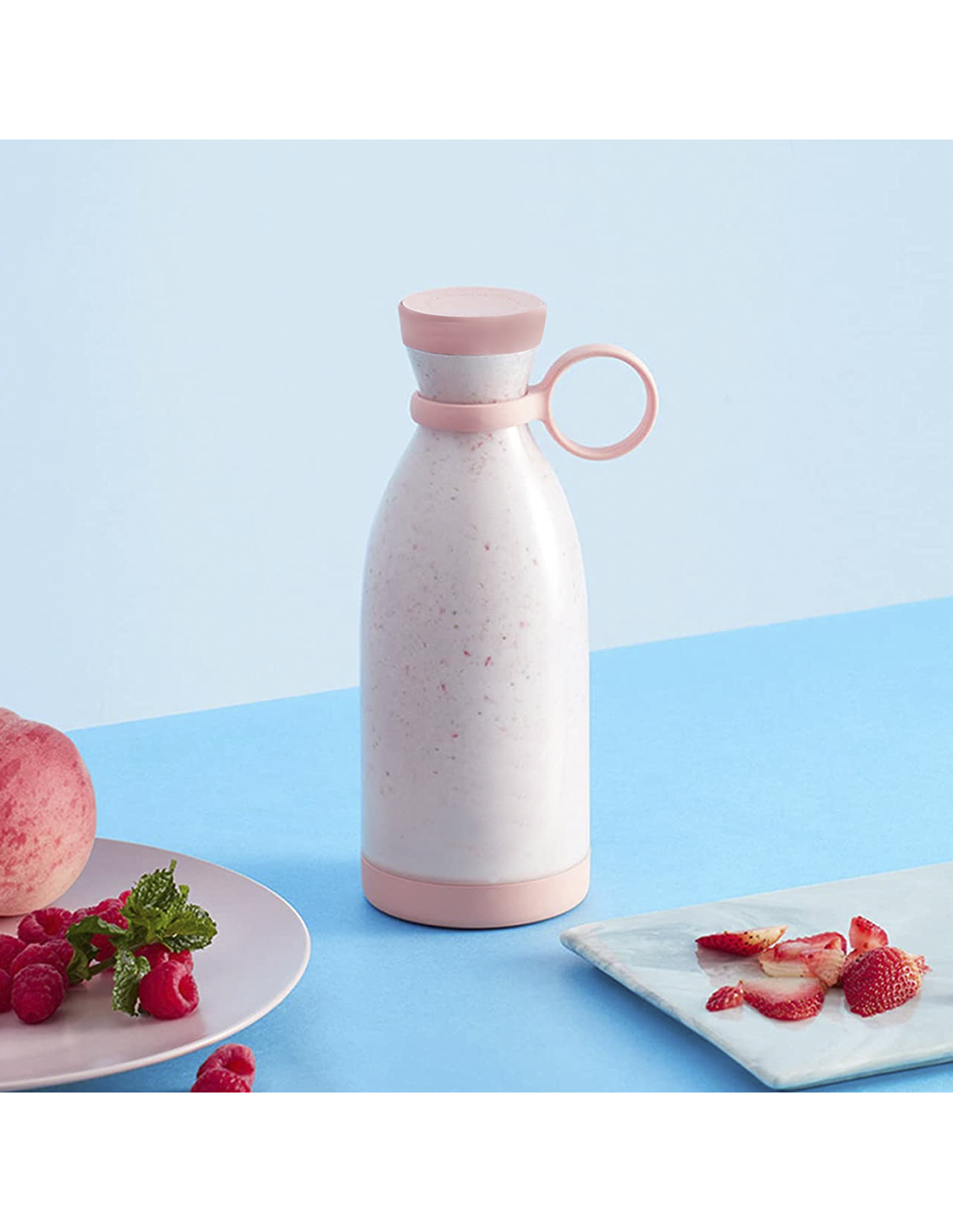 Potente frullatore, con un motore da 40W e 3 lame in acciaio. L'utilizzo è davvero semplice: basta sminuzzare la frutta, chiudere il tappo e inclinare in diagonale la bottiglia, dopodiché puoi fare doppio click sull'interruttore, posto al lato inferiore, ed il frullatore comincerà il suo lavoro, in 20-30 secondi avrai un buon frullato da gustare. Puoi versare il contenuto in una tazza o bere direttamente dalla bottiglia.