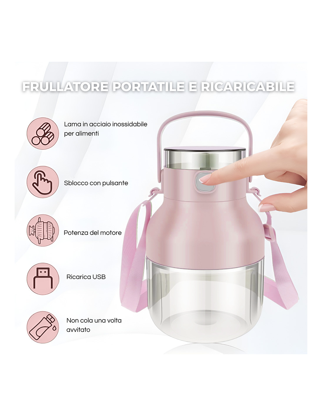- Potente e ricaricabile: Batteria al litio da 1500mAh e potenza di 70 watt per una frullatura rapida e lunga durata.