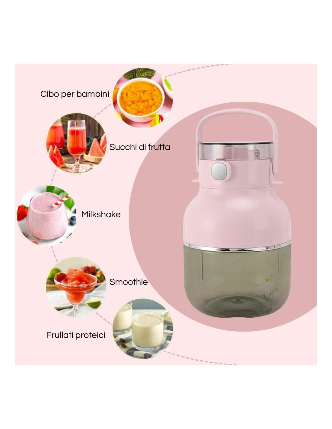 - Contenitore da 500ml: Perfetto per preparare frullati, milkshake e bevande fresche in qualsiasi momento della giornata.