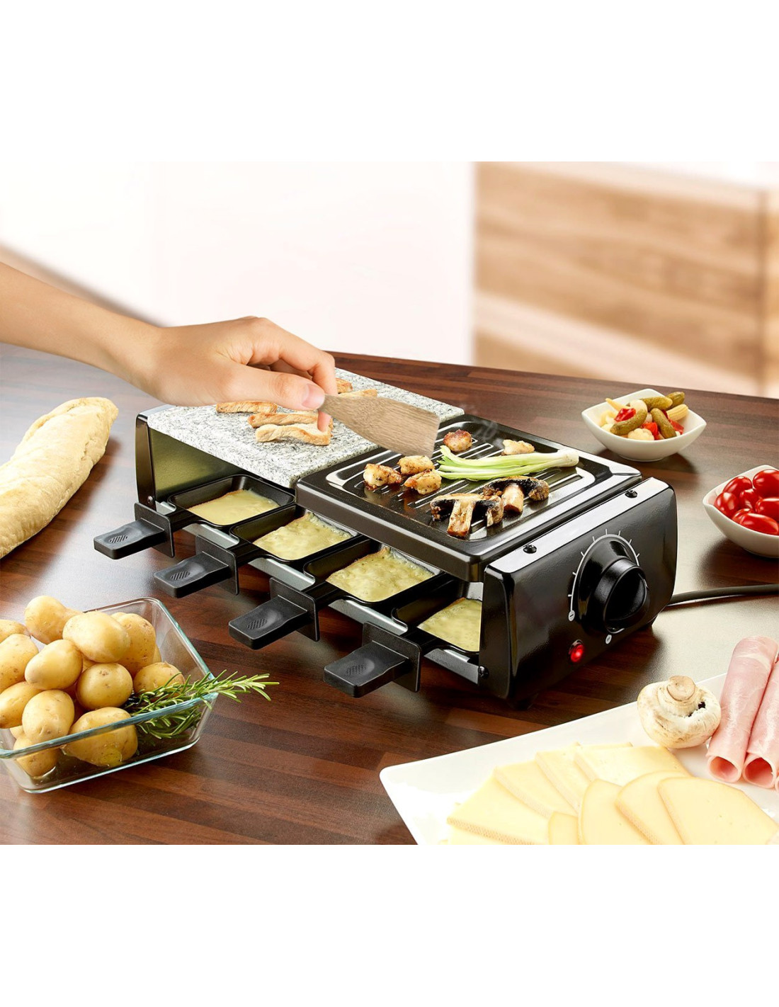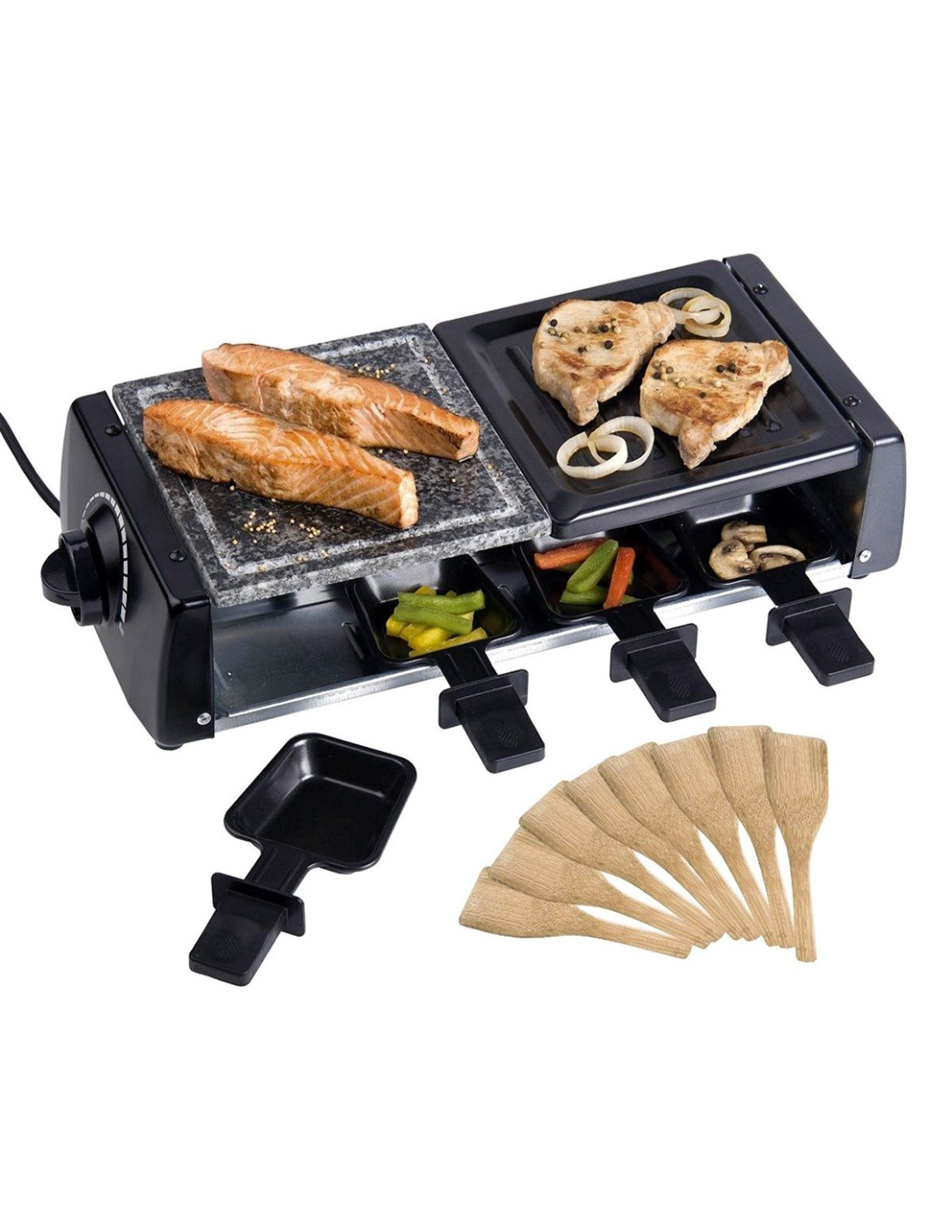 Superficie con doppia cottura è possibile creare molti piatti diversi contemporaneamente come grigliate o arrosto su pietra, in padella o sotto il grill, ideale per feste e barbecue! Carne, pesce o verdure, tutto può essere cucinato simultaneamente. Con il termostato a regolazione continua, è possibile controllare il calore in modo corretto. La pietra naturale accumula particolarmente bene il calore; grazie all’alta temperatura del grill, i pori della carne si chiudono subito, gli alimenti si cuociono più delicatamente e rimangono teneri e succosi. Piastra del grill con rivestimento antiaderente.