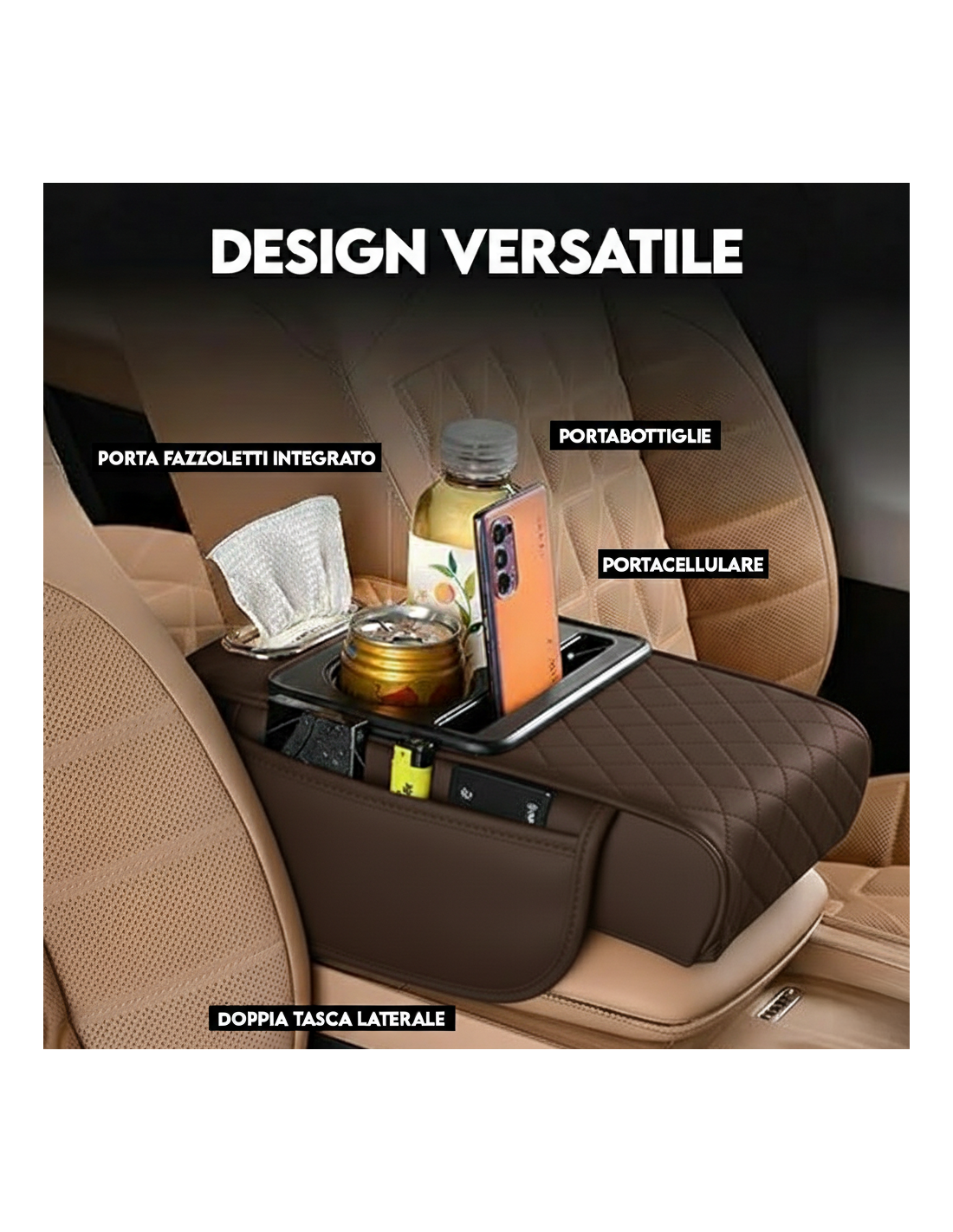 ● SISTEMA MULTIVANO: Progettato con scomparti dedicati per ottimizzare lo spazio, include un vano portabicchiere stabile, un supporto per smartphone e un pratico porta fazzoletti integrato.
