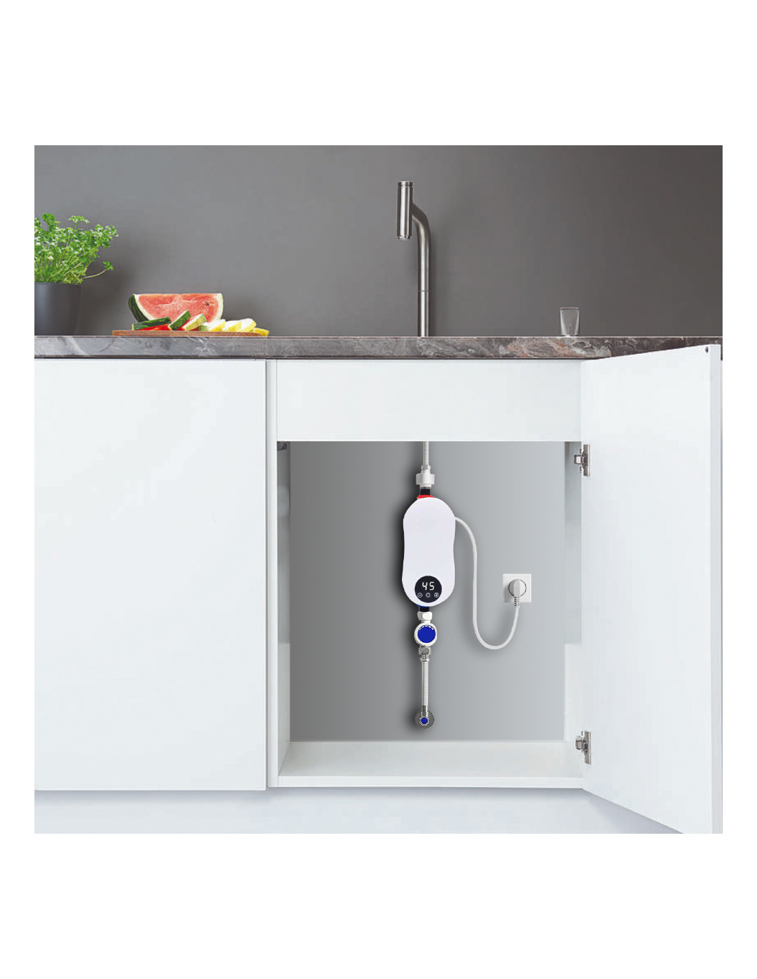 E' progettato per occupare il minimo spazio, il mini scaldacqua può essere installato facilmente in diversi ambienti, come il bagno, la cucina o altre zone della casa dove sia necessaria una fonte di acqua calda immediata. Il kit include tutti i componenti necessari per l’installazione.