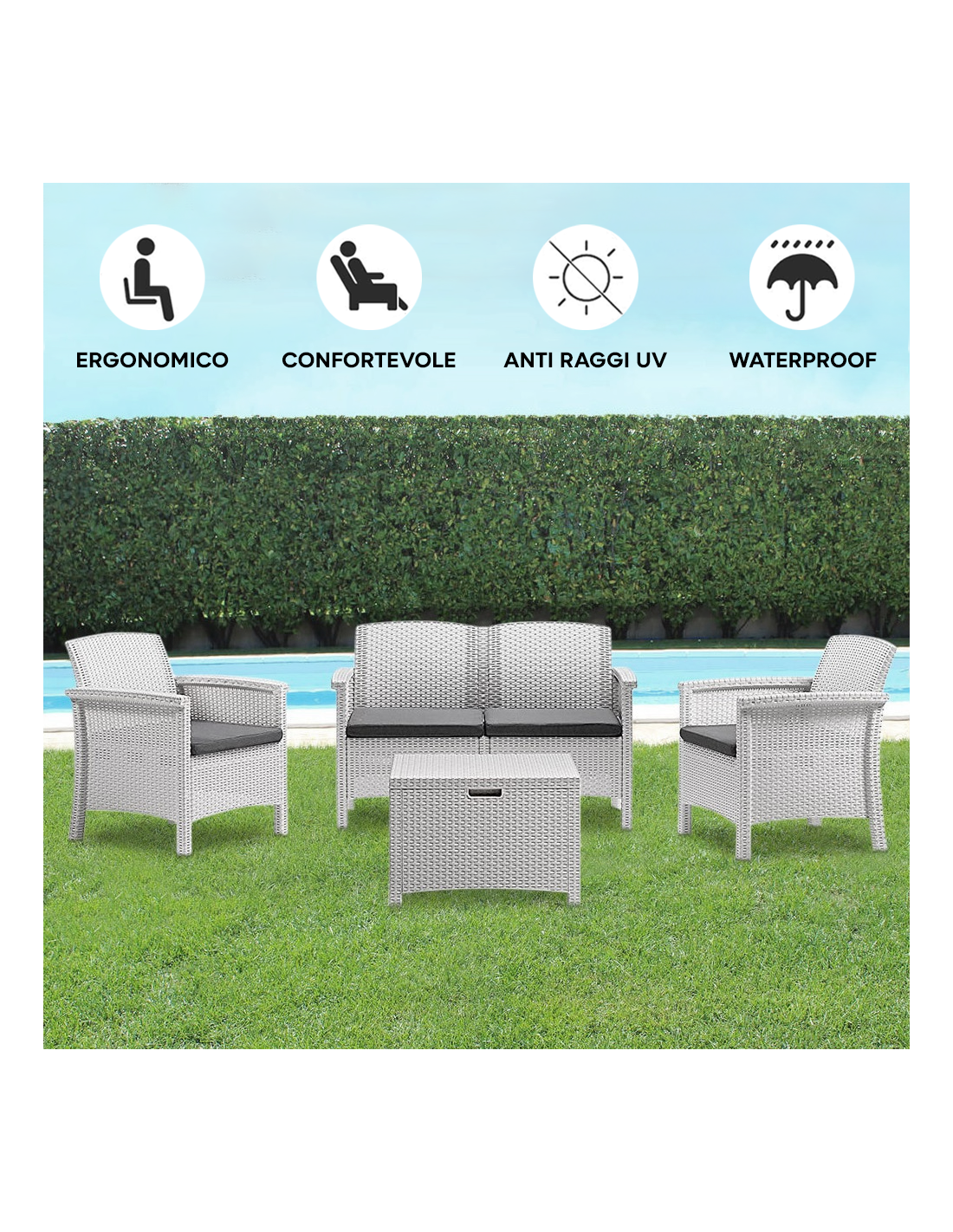 Immagina di trascorrere le tue giornate all'aria aperta, circondato da un'atmosfera di puro relax e comfort. Il set salottino VENEZIA da giardino in polipropilene effetto rattan è la chiave per trasformare questa visione in realtà. Composto da un divanetto due posti, due poltrone e un tavolino basso d'appoggio a contenitore, questo set è un oggetto di design e funzionalità. Realizzato in plastica resistente e impermeabile, è in grado di resistere a qualsiasi avversità metereologica, dal sole cocente alla pioggia battente. Le ampie sedute con schienale alto e comodi poggia braccia, insieme ai morbidissimi cuscini, offrono un comfort senza pari. Il tavolino d'appoggio non è solo un semplice tavolino, ma un meraviglioso contenitore che ti permette di tenere a portata di mano tutto ciò di cui hai bisogno.