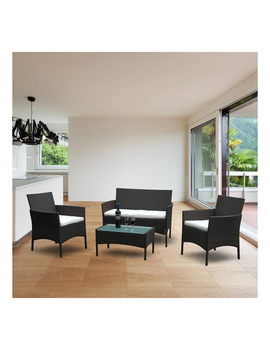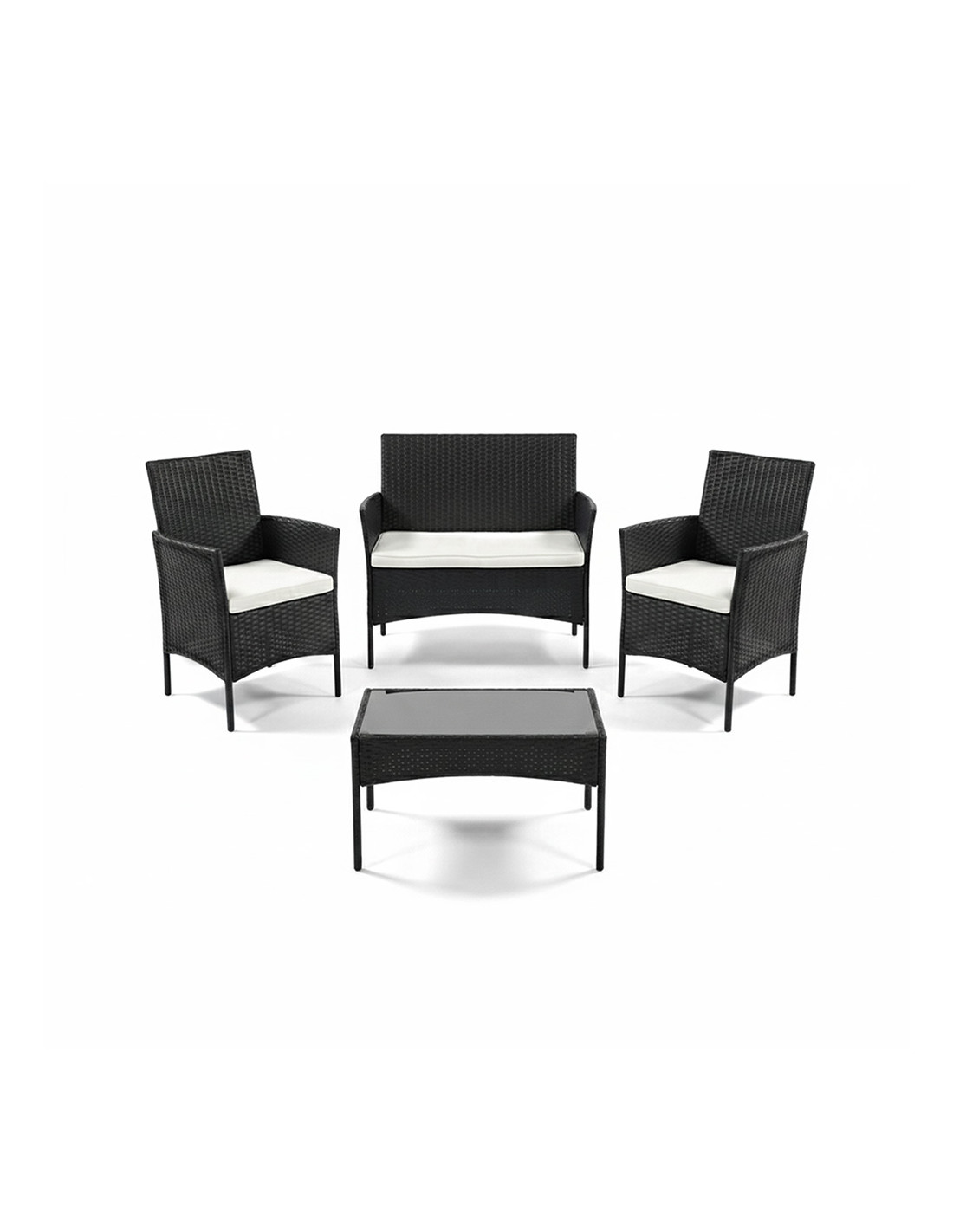 ● SET COMPLETO 4 POSTI: include un divano a 2 posti, 2 poltroncine singole e un tavolino basso con ripiano in vetro.
