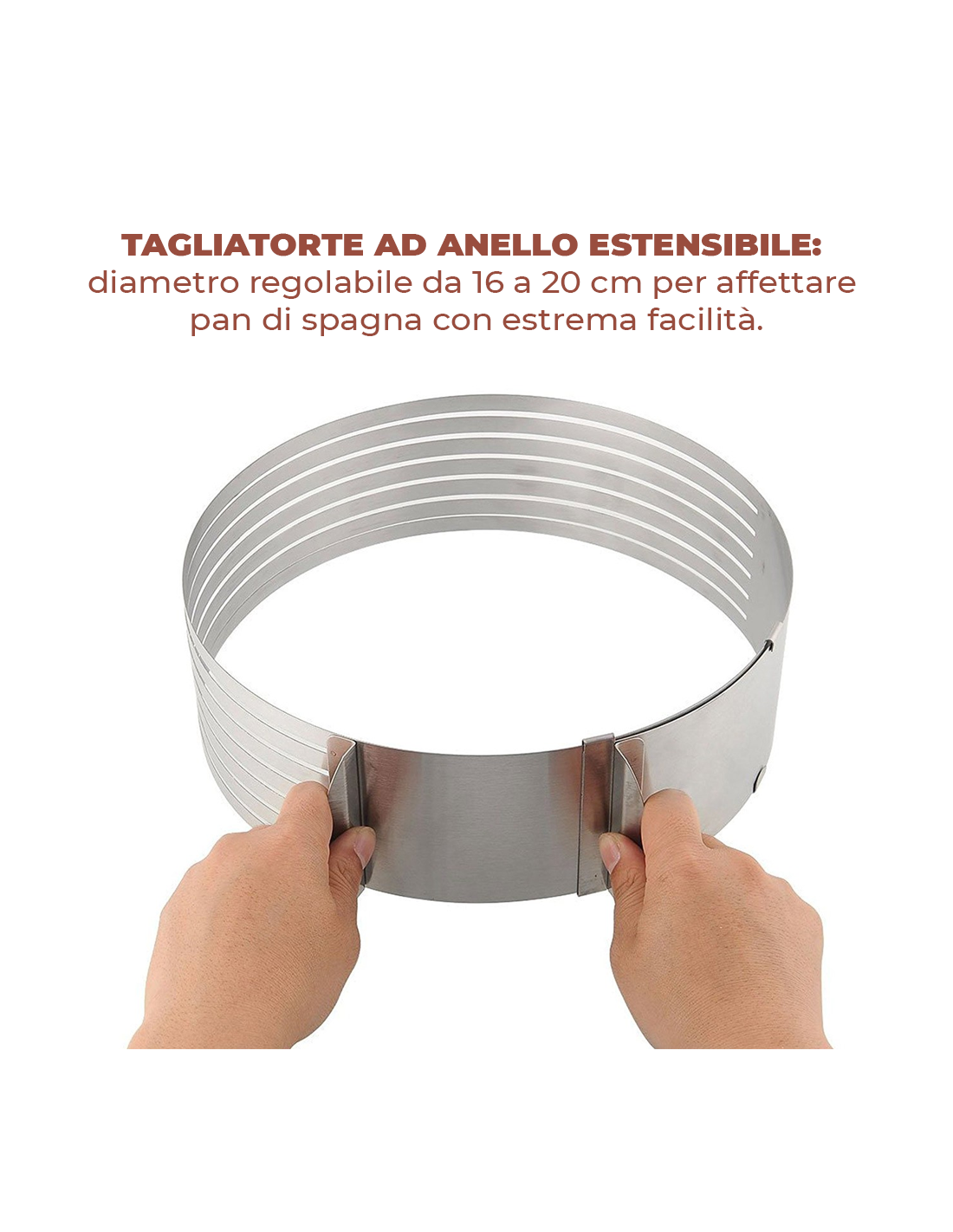 Anello in acciaio inox dotato di 7 scanalature circolari che ti permettono, inserendo il coltello, di tagliare il pan di spagna di vario spessore in maniera precisa. Il pan di spagna si inserisce all'interno dell'anello, il quale , si regola facilmente in diametro a partire da 16 ai 20 cm. Utilizzare questo strumento è semplicissimo, una volta cotto e raffreddato il pan di spagna basta inserirlo nell’anello in acciaio e quindi stringerlo. Tenendo premuto con una mano far scorrere il coltello partendo dallo strato più alto.